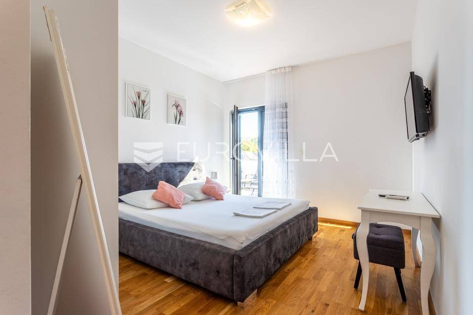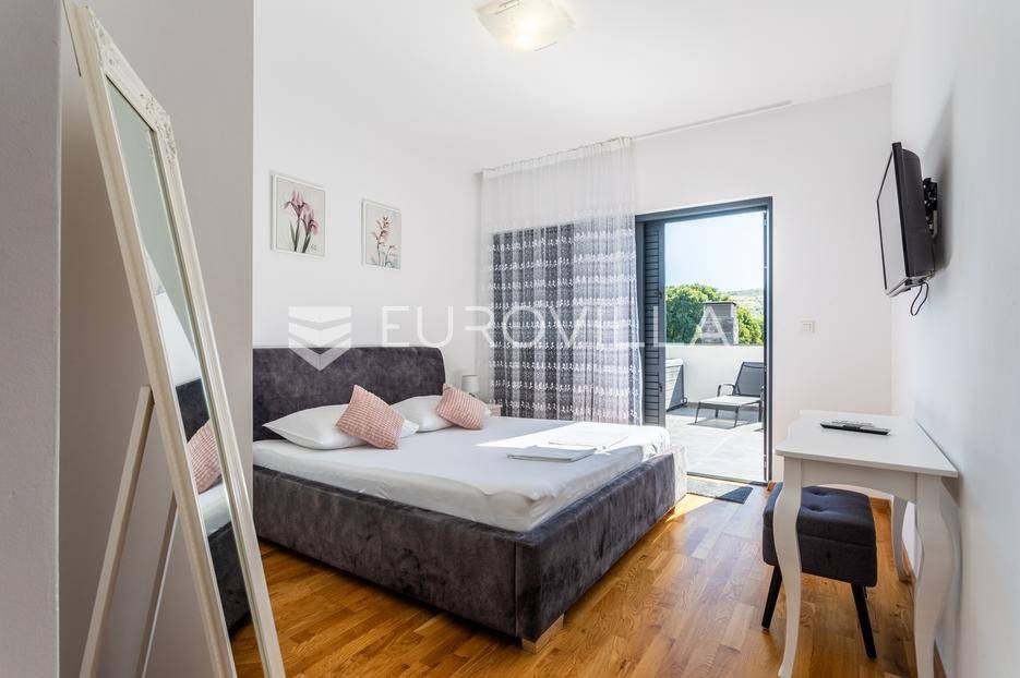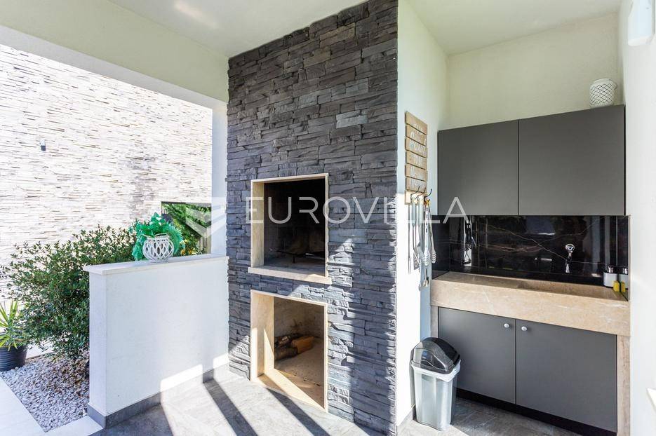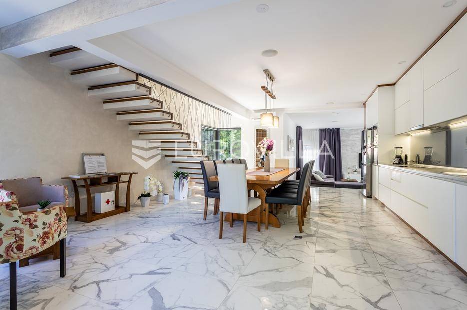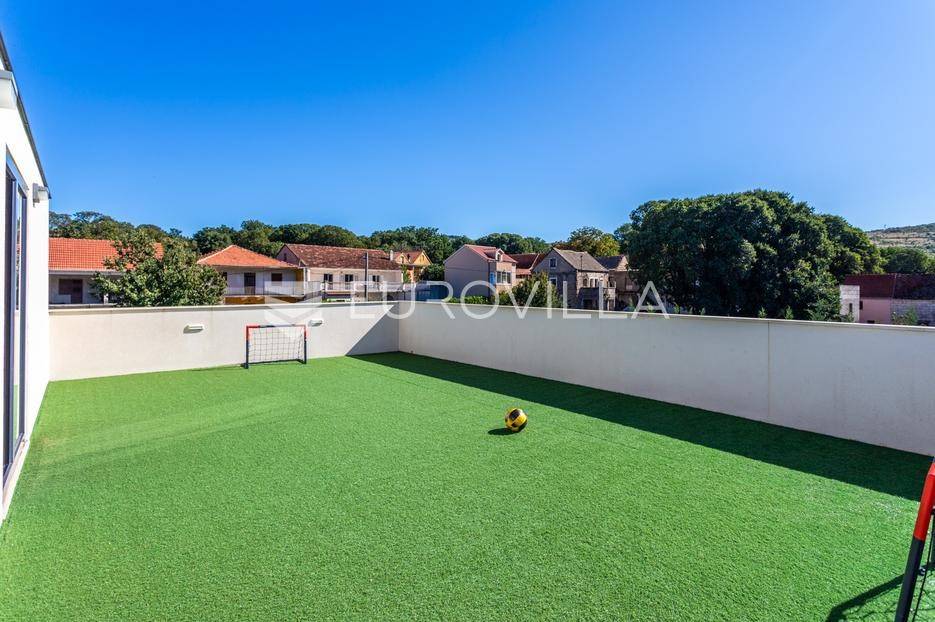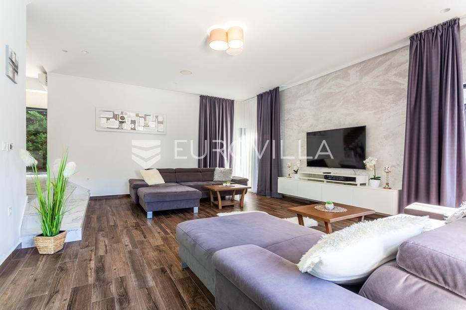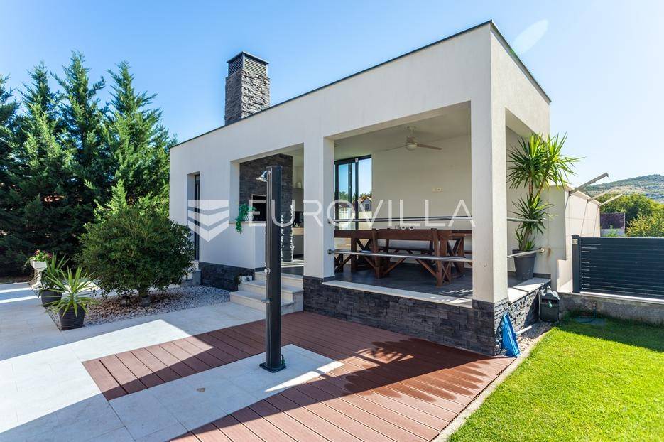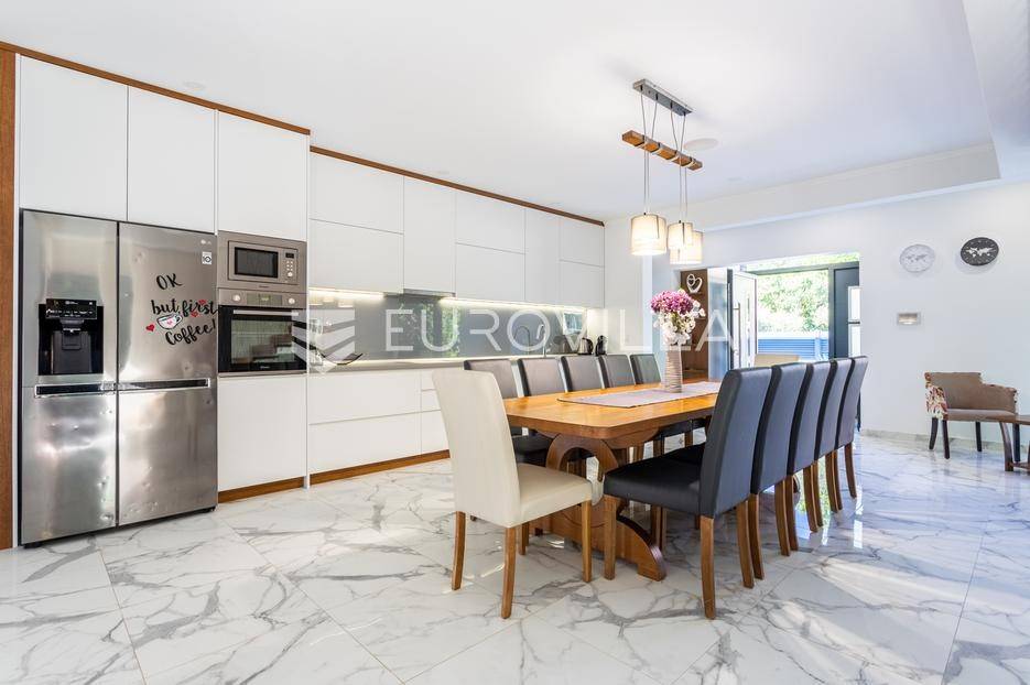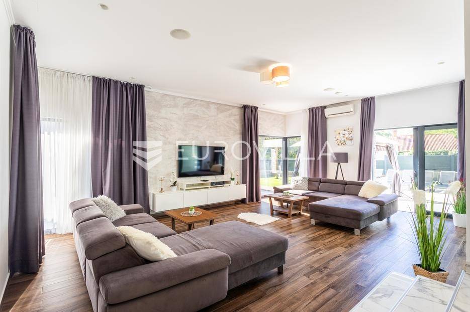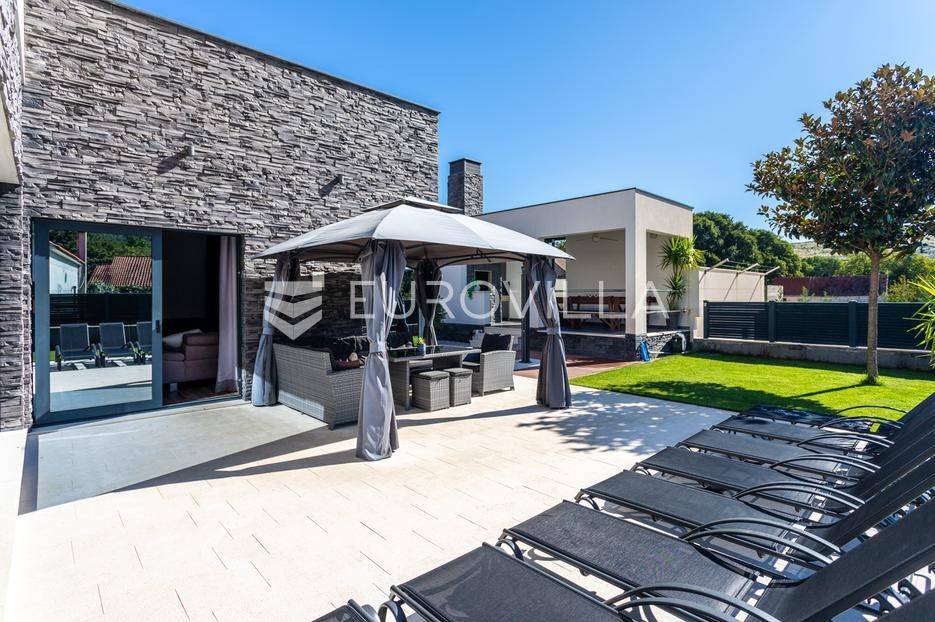 Dugopolje, prostrana i suvremeno uređena vila od 350 m², smještena na velikom zemljištu površine 1514 m², pruža vrhunski komfor i luksuz. Dostupna za dugoročan najam od listopada 2025. godine.Vila se sastoji od kompletno opremljene kuhinje s modernim aparatima, prostranog i elegantnog dnevnog boravka idealnog za obiteljska okupljanja, četiri udobne spavaće sobe, pet luksuznih kupaonica, funkcionalne praonice, unutarnjeg bazena za opuštanje, te teretane opremljene najnovijom opremom i saune za dodatnu relaksaciju. Prostrana terasa savršena je za uživanje na svježem zraku, uz mogućnost organizacije vanjskih druženja.Kuća je opremljena podnim grijanjem i grijanim bazenom, ali zahvaljujući postavljenim solarnim panelima potrošnja struje je minimalna.Tri spavaće sobe imaju izlaz na terasu s jacuzzijem, ispred kuće je igralište za mali nogomet kao i teniski teren.Smještena u mirnom okruženju Dugopolja, vila pruža potpunu privatnost i udobnost, a istovremeno je u blizini svih ključnih sadržaja i prometnih veza, čineći je lako dostupnom za svakodnevne potrebe ili istraživanje regije.Ova nekretnina idealna je za obitelji zbog blizine međunarodne škole ili poslovne ljude koji traže luksuzni smještaj pogodan za dulji boravak samo 20 minuta vožnje do Splita.Za sve dodatne informacije i upite, slobodno nas kontaktirajte.