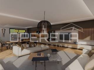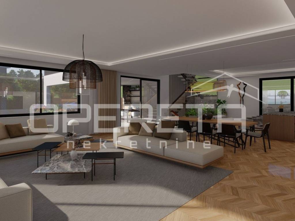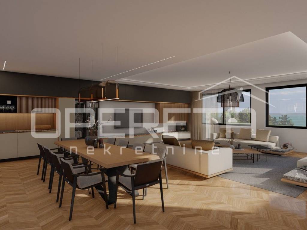 Unutarnje stubište vodi na prvi kat, gdje se prostire otvoreni dnevni prostor ukupne površine 102 m² – raskošno oblikovan dnevni boravak s kuhinjom i blagovaonicom. Iz ovog prostora izlazi se na natkrivenu terasu veličine 60 m², koja nudi savršeno mjesto za objedovanje na otvorenom, s pogledom koji oduzima dah.