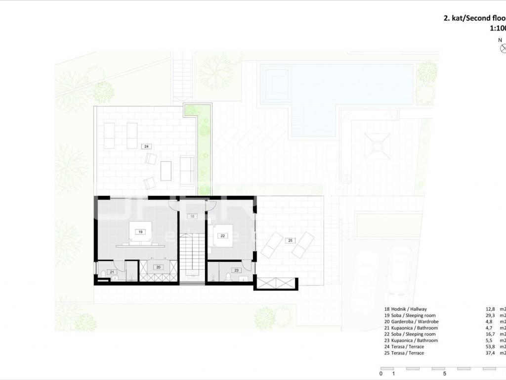 Na drugom katu smještene su još dvije spavaće sobe, svaka sa svojom kupaonicom i izlazom na prostrane privatne terase koje pružaju dodatnu razinu privatnosti i luksuza.