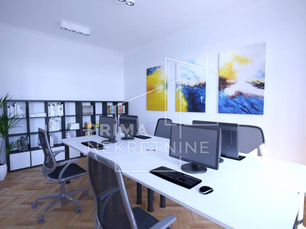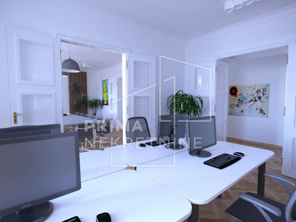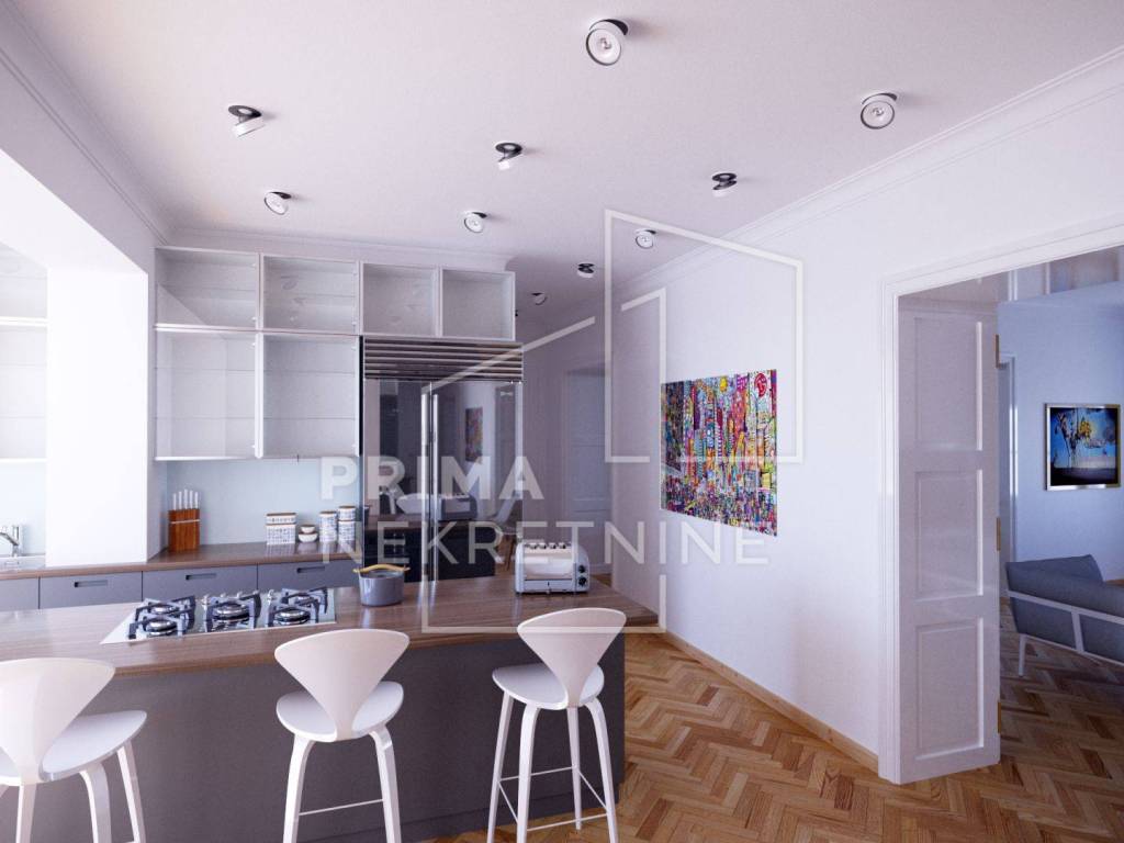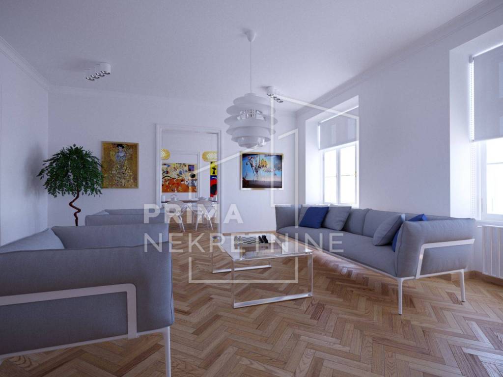 U ponudi je atraktivan prostran stan površine 141 m2, smješten na trećem od ukupno pet katova uredno održavane zgrade u samom srcu Zagreba.