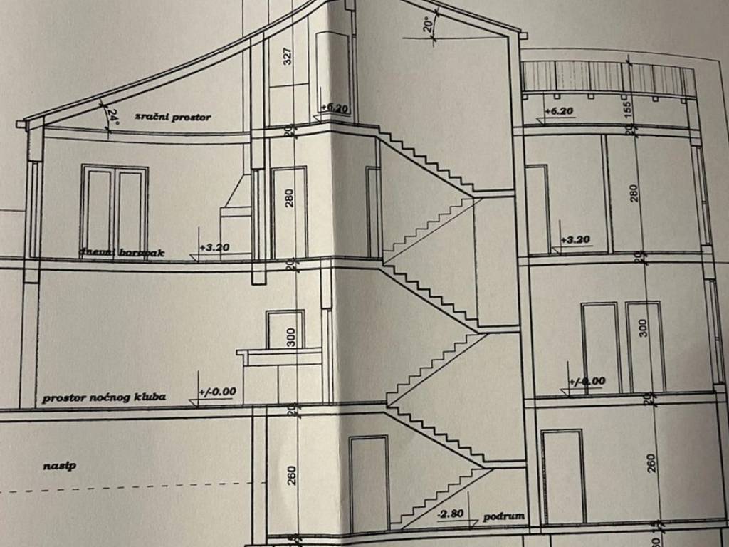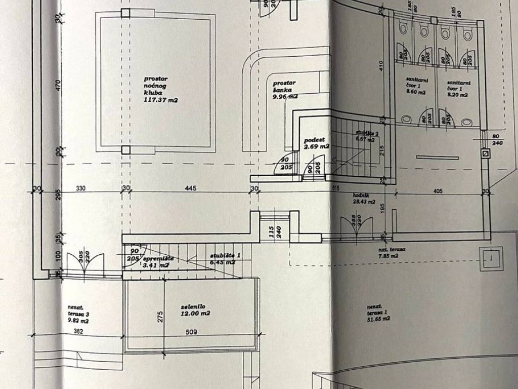PRIZEMLJE - prostor noćnog kluba (117,37 m2), prostor šanka (9,96 m2), hodnik (28,43 m2), 2 sanitarna čvora (8,60 m2, 8,20 m2), spremište (2,56 m2), natkrivena terasa (3,93 m2), 3 nenatkrivene terase (12,92 m2, 7,19 m2, 2,46 m2), podest (2,69 m2), 2 stubišta (6,45 m2, 6,67 m2)