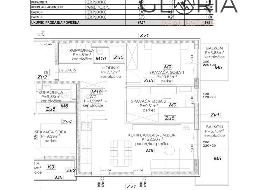 - balkon (ker.pločice) (3,88 x 0,25) 0,97 m2