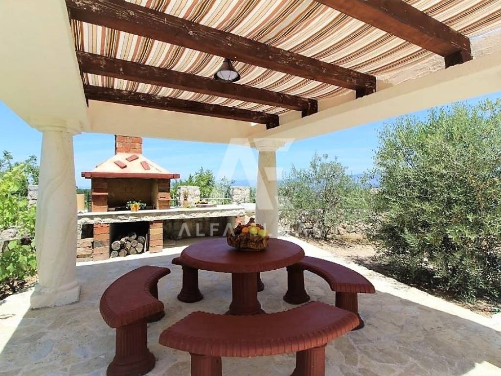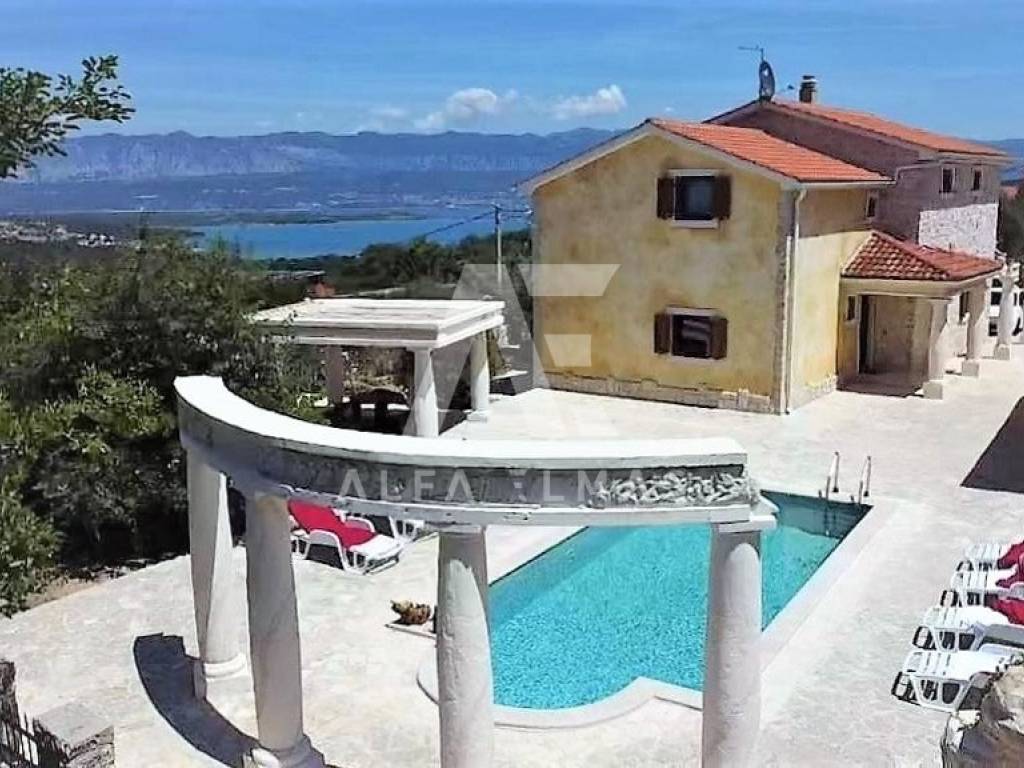 Dobrinj, okolica šarmantna vila osebujnog stila starogrčkih bogova!! Prekrasna kamena vila rađena u tradicionalnom stilu, te su za uređenje i dizajn korišteni uglavnom kamen i drvo. Vila je izgrađena 2018 godine, ukupne površine od 480m2 podijeljena na dvije etaže, prizemlje i kat. U prizemlju vile je potpuno opremljena kuhinja s blagovaonicom i dnevnim boravkom oslikano crticama iz grčke mitologije otvorenog koncepta na koji se nadovezuje direktni pristup kamenoj terasi. Vlastita spa i wellness zona u stilu grčkih bogova osiguravaju apsolutnu udobnost. Etaža raspolaže sa ukupno 4 spavaćih soba s vlastitim kupaonicama te dvije sobe imaju izlaz na balkon s koje se puža predivan pogled na more. Uređena okućnica odiše mediteranskom stilu sa sunčalištem, bazenom, maslinama i mediteranskim biljem te ugodan prostor natkrivene ljetne kuhinje s roštiljem, dodatnim objektom-spremište kao i parking za više parkirnih mjesta. Vila u okolici Dobrinja je izgrađena po najvišim standardima kvalitete i s velikom pažnjom na detalje koji prostorima daju čar grčke mitologije.