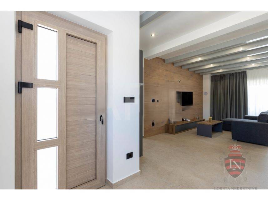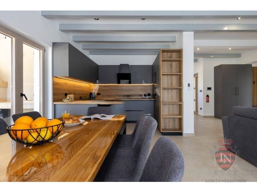 Iz dnevnog boravka pruža se predivan pogled na veliki bazen dimenzija 4 x 10 m, okružen sunčalištem i pažljivo uređenom okućnicom, stvarajući idealan prostor za osvježenje i uživanje tijekom ljetnih mjeseci.