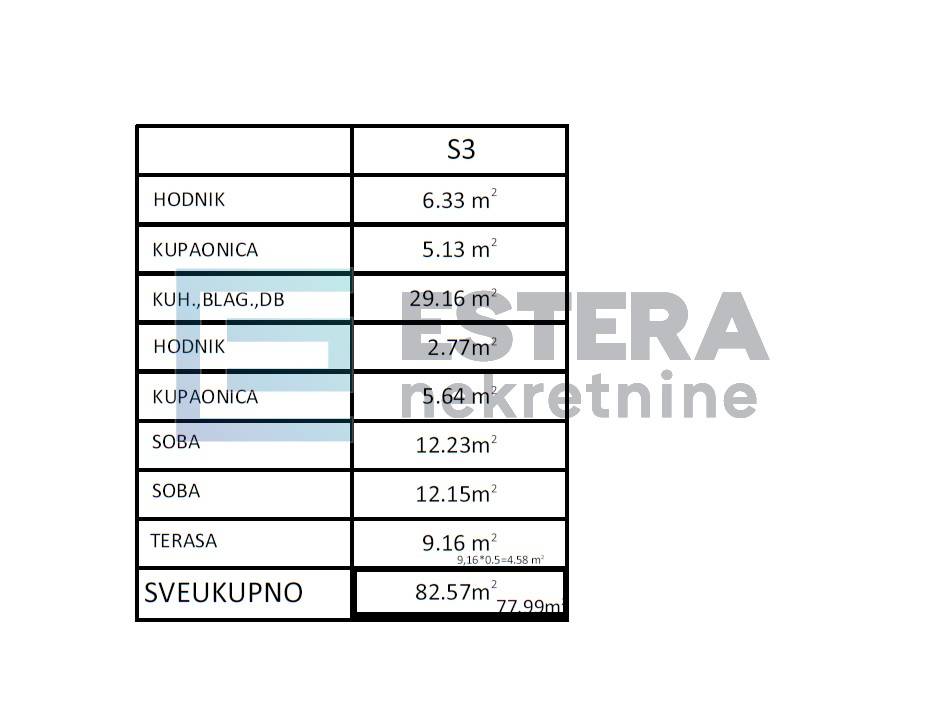 Prodaje se moderni trosobni stan (S3), ukupne površine 77,99 m2, na drugom katu manje stambene zgrade s ukupno 6 stanova.