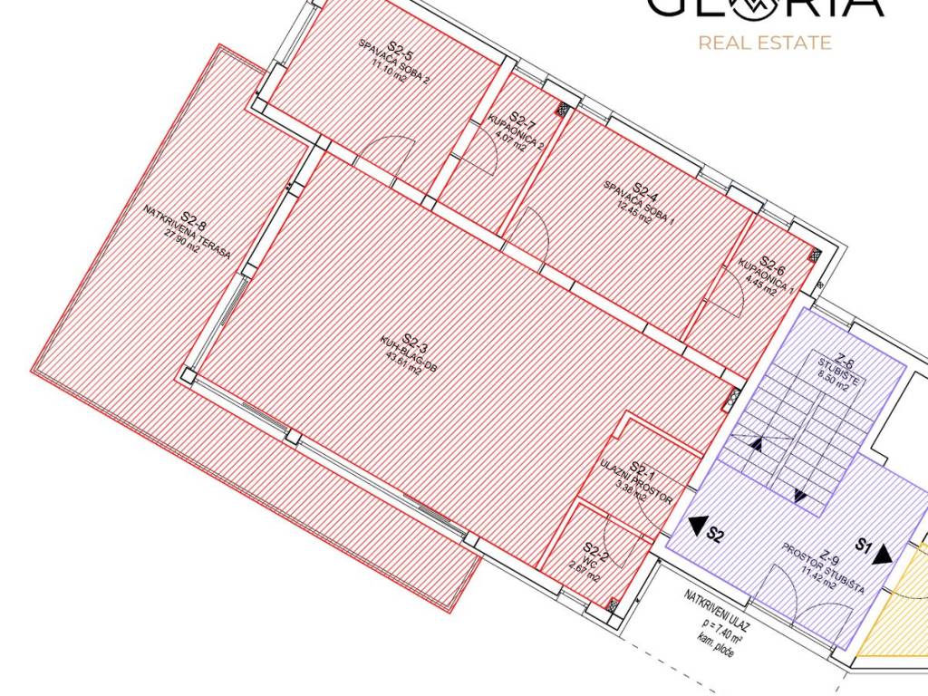 Zgrada se sastoji od podruma, prizemlja, dva kata i nadgrađa na kojima je smješteno ukupno 7 luksuznih stanova. U podrumu se nalazi velika garaža (67,90 m2) koja pripada penthouse stanu oznake S7 te ostave koje pripadaju stanovima i zajednička teretana s kupaonicom koja predstavlja zajednički sadržaj koji pripada svim stanarima. Na prizemlju i prvom katu se nalaze po dva kata, dok drugi kat s nadgrađem u cijelosti čini jedan stan – penthouse.
