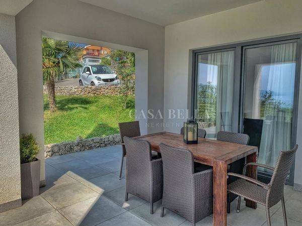 CASA BELLA iz ponude izdvaja ovaj jedinstveni, moderni stan od 170 m² smješten u urbanoj vili s dva stana u prestižnoj lokaciji Brestovice na Kastvu. Stan se nalazi u prizemlju privatne kuce  i nudi očaravajući, panoramski pogled na cijeli Kvarnerski zaljev, pružajući ne samo udobnost, već i osjećaj luksuza.