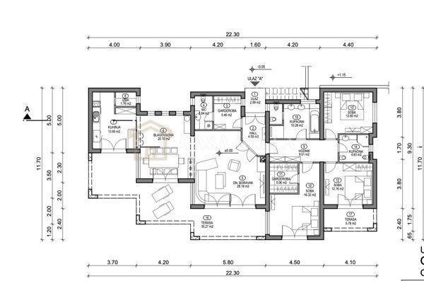 Prostrani interijer sastoji se od tri sobe, prostranog dnevnog boravka, elegantne blagovaonice, moderne kuhinje, dvije kupaonice i dodatnog toaleta. Velika terasa i balkon dodatno upotpunjuju prostor, nudeći savršen ambijent za opuštanje i uživanje u prirodi.