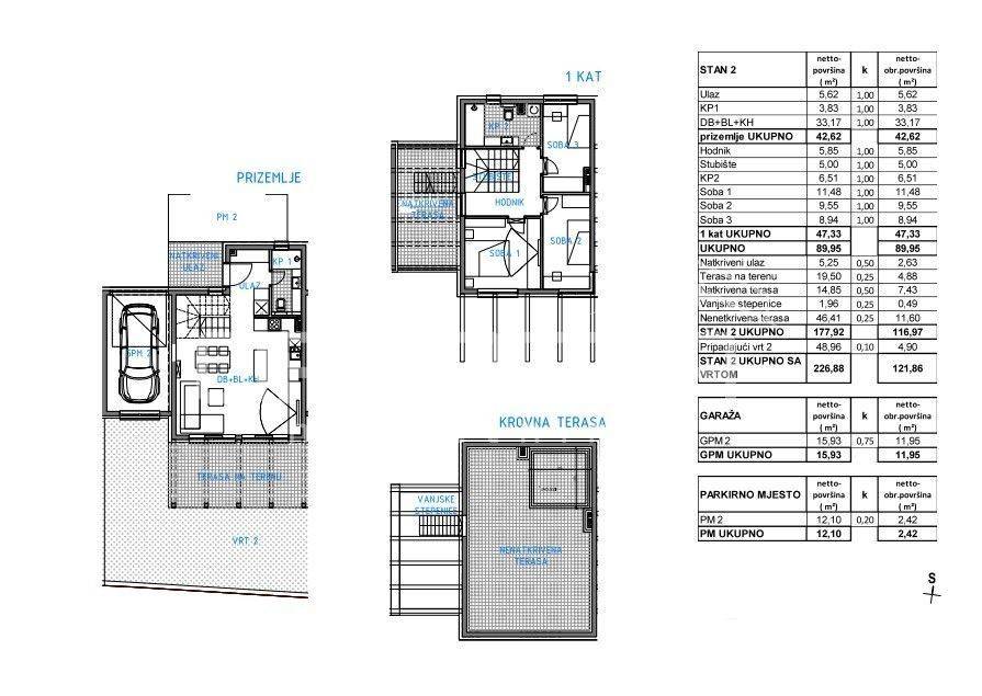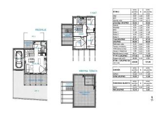 Stambena površina iznosi 116,97 m2. Prizemlje se sastoji od kuhinje s blagovaonicom, dnevnog boravka koji ima izlaz na vrt te kupaonice dok se na katu nalaze tri spavaće sobe i kupaonica.