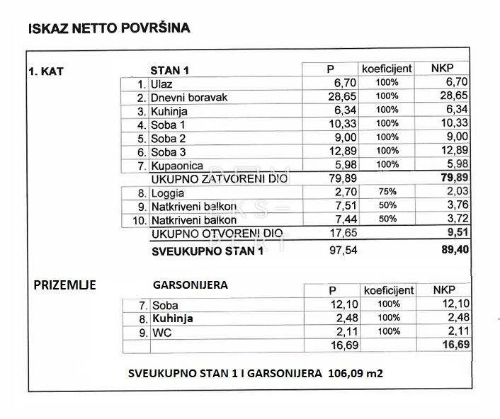 STAN: hodnik, kuhinja, blagovaonica i dnevni boravak sa izlazom na zatvoreni balkon i natkriveni balkon, tri spavaće sobe (dvije sa izlazom na zatvoreni balkon i jedna sa izlazom na lođu) i kupaonica, ukupne površine 89,40 m2.