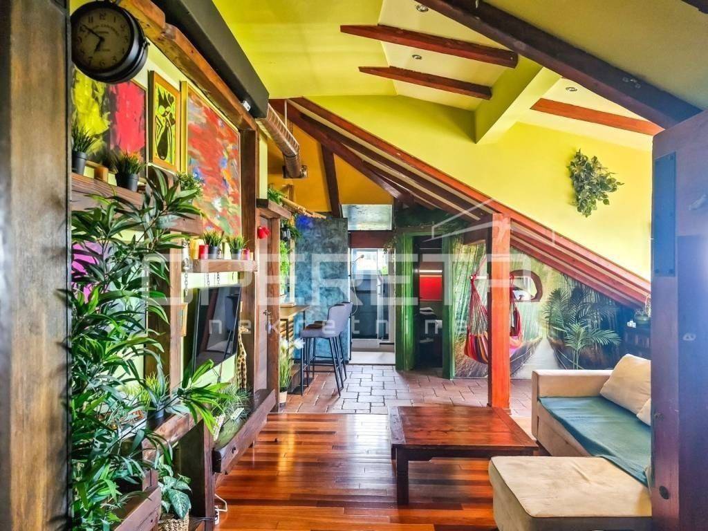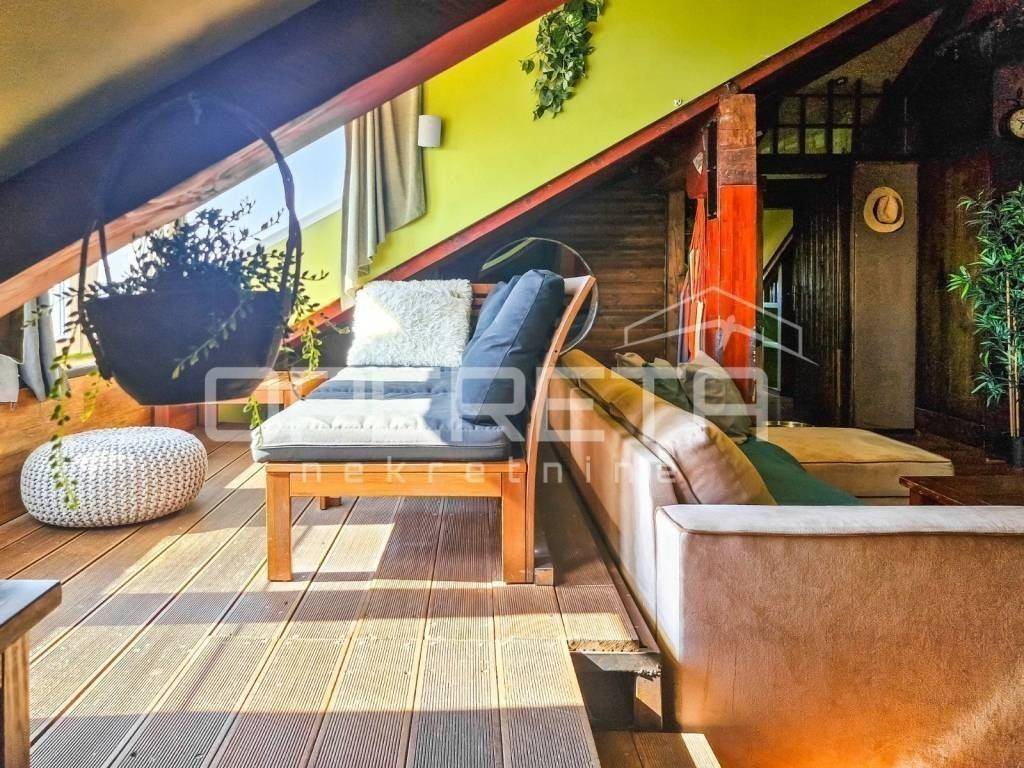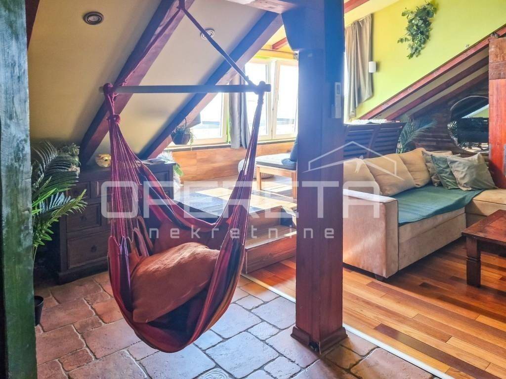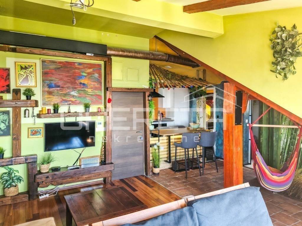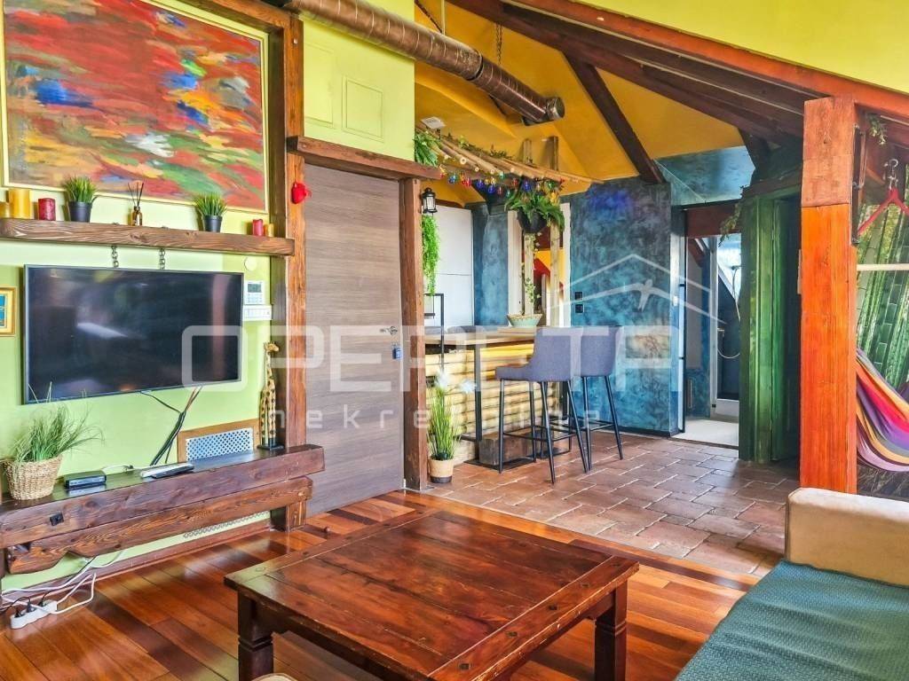 Manji, južni stan, s pogledom na Srđ i krovnim prozorom prema moru, sastoji se od otvorenog dnevnog prostora s kuhinjom i blagovaonicom, spavaće sobe, galerije s kutkom za odmor, prostorom za rad te kupaonice.