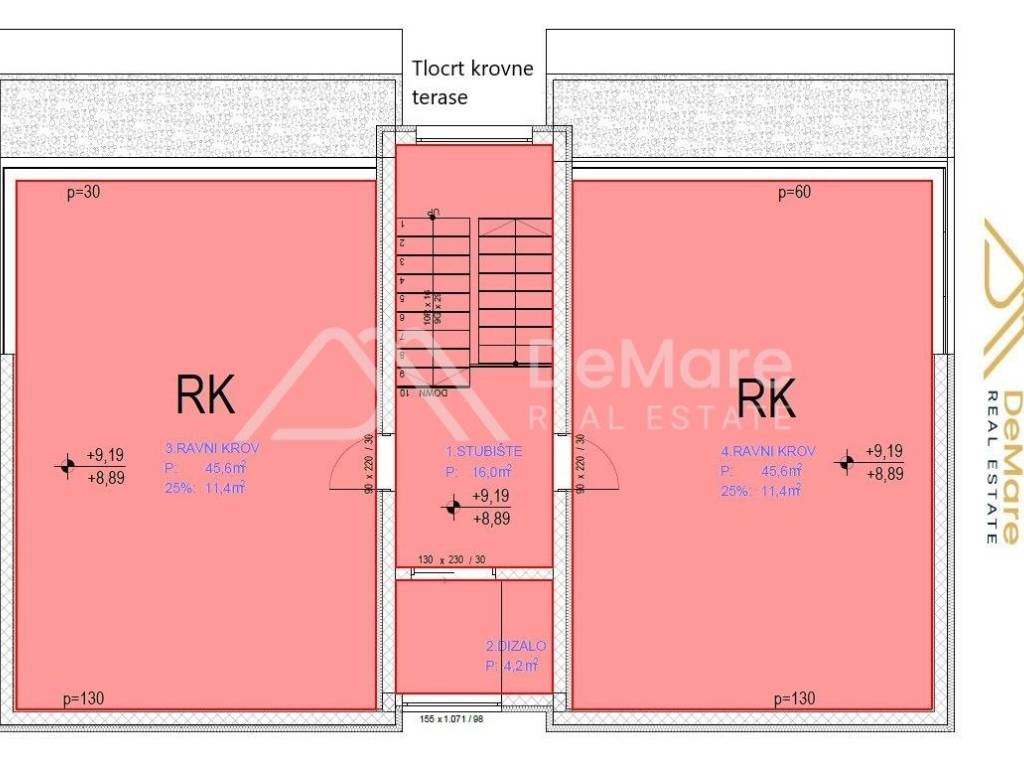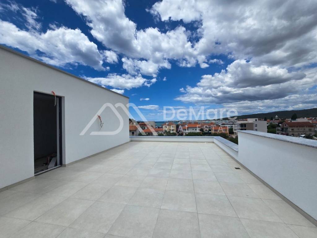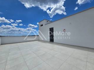 Iznad stana nalazi se prekrasna krovna terasa na koju se može doći stubištem ili liftom iz stana (111,40 m2), a sa koje se pruža panoramski pogled na more i otoke.