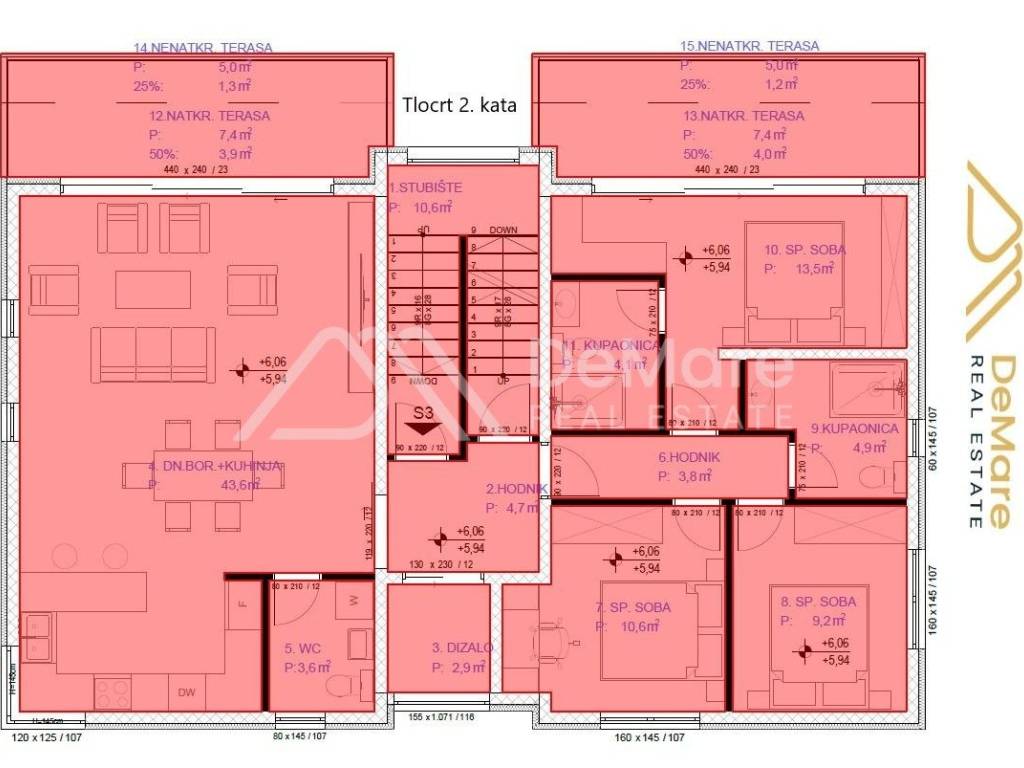 Unutarnja površina stana je 111,48 m2 a obračunska vrijednost korisne površine stana sa svim pripadcima iznosi 213,34 m2.