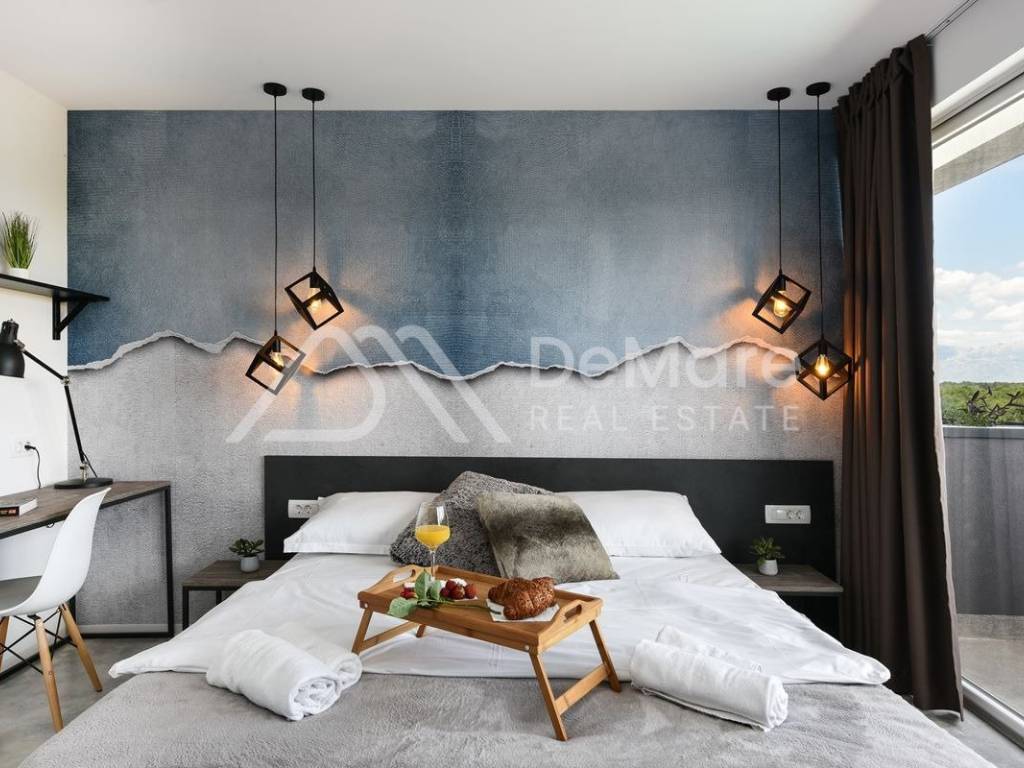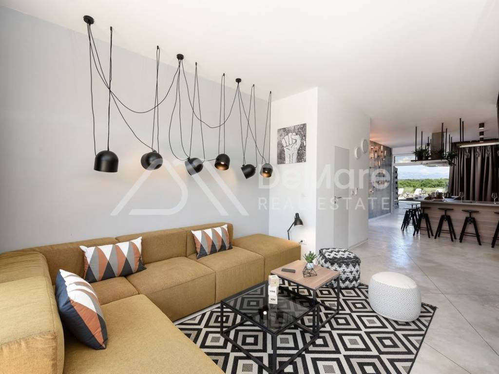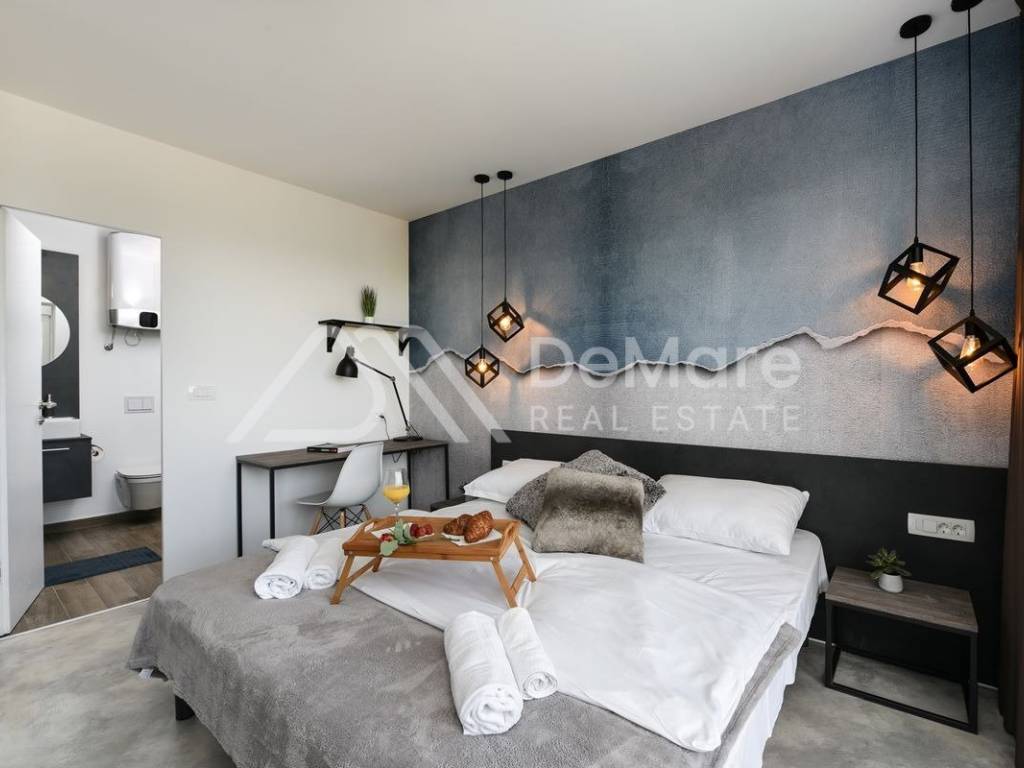 Svi apartmani su uređeni prema najvišim dizajnerskim standardima. Kuhinje su opremljene najmodernijim uređajima. Svaki apartman ima svoj ulaz i izlaz na bazen.