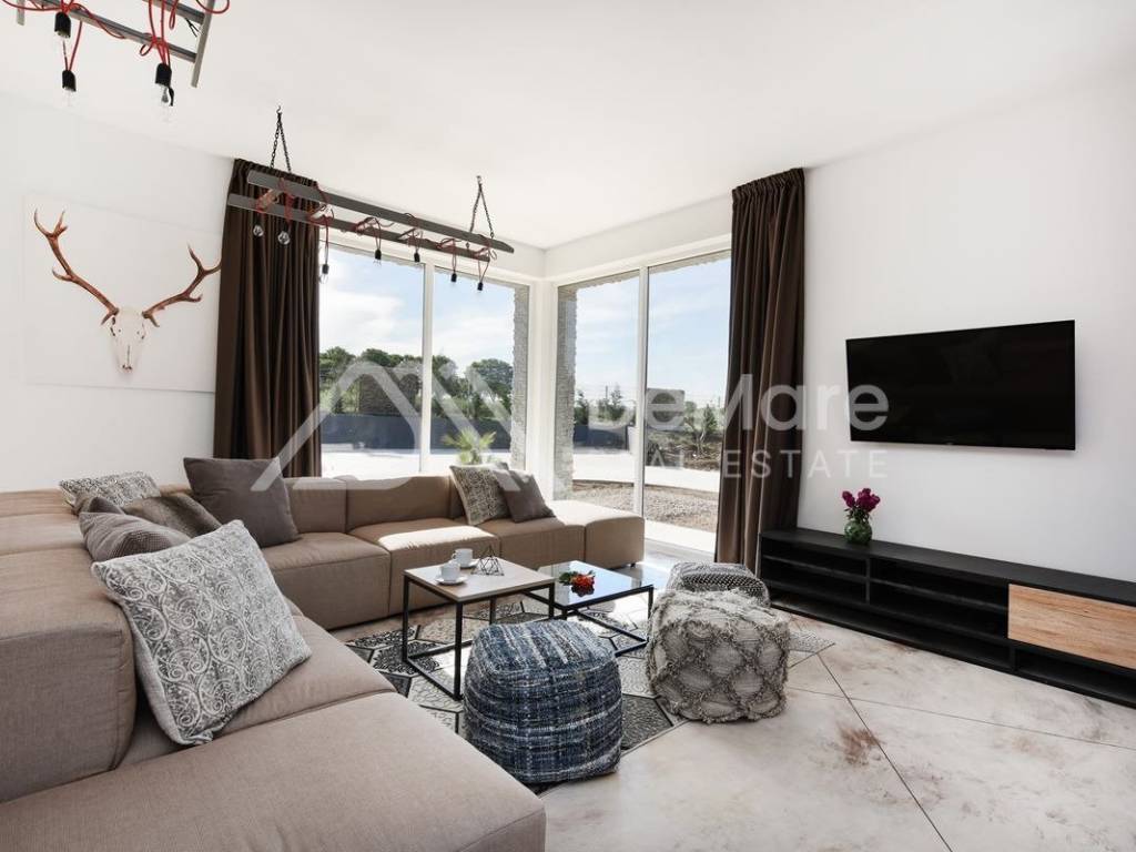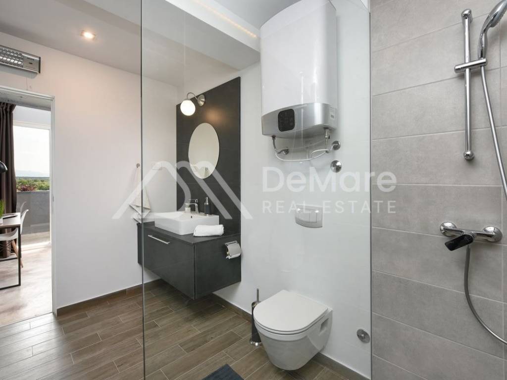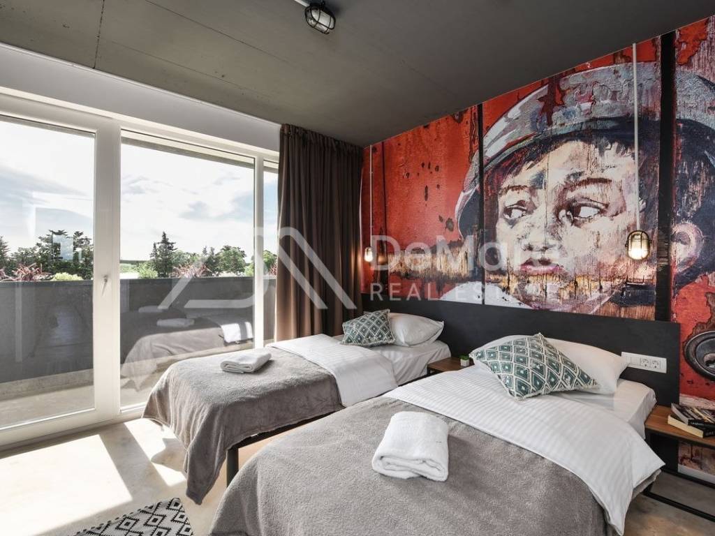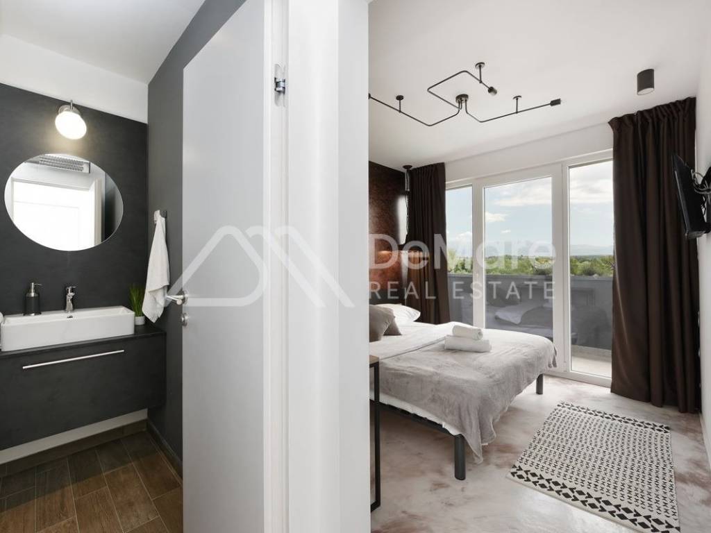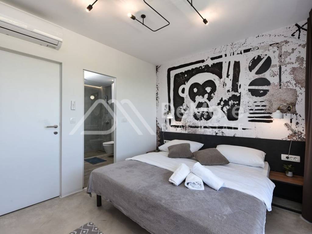 U vili se nalaze još dva apartmana, svaki veličine 150 m2. U svakom od njih su 4 spavaće sobe, 4 kupaonice, odvojeni wc i komforan su smještaj za 8 osoba po apartmanu. Vila je savršena za sve one koji žele uživati u miru i tišini, daleko od gradske buke, a u dodiru sa prirodom. Ovaj spoj moderne arhitekture , vrhunskog dizajna, prekrasne prirode i pristupačne lokacije, čini vilu savršeno funkcionalnom jedinicom za bavljenje turizmom u blagoj mediteranskoj klimi.