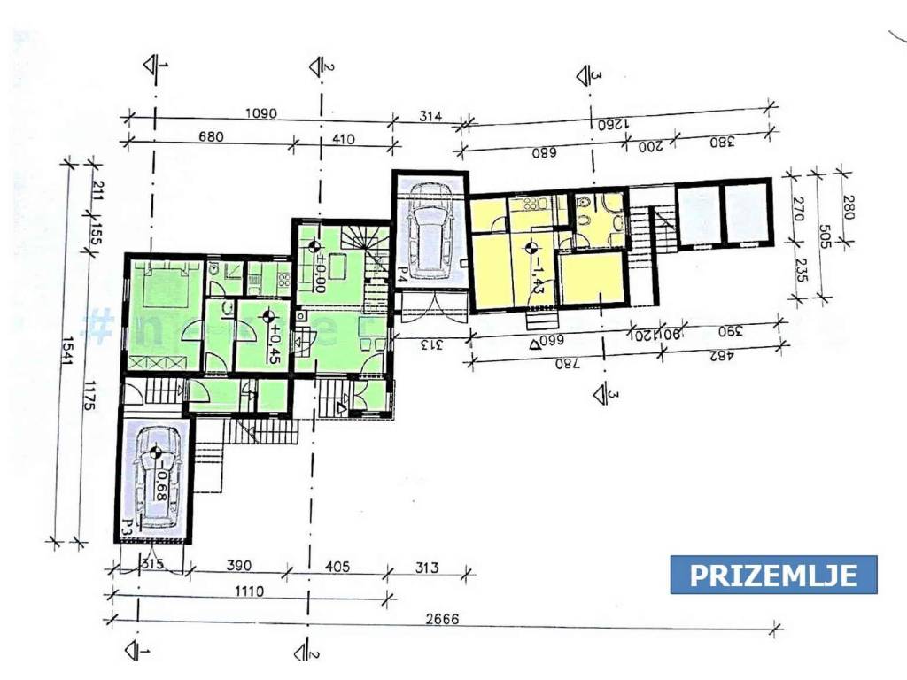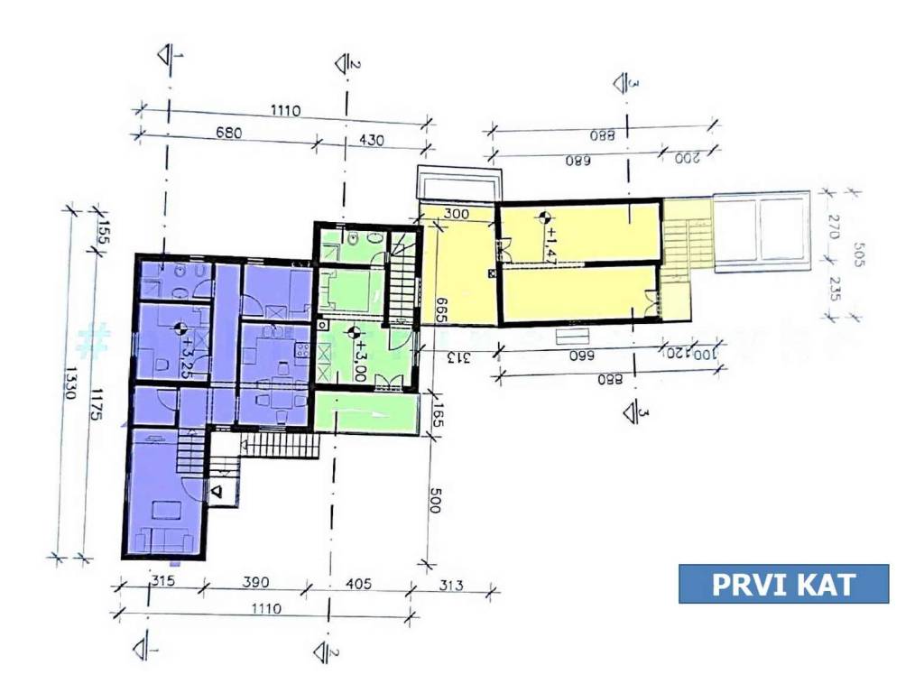 Kuća je u naravi 3 stana, dvije garaže, pomoćni prostor.