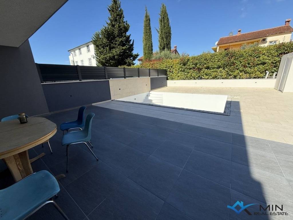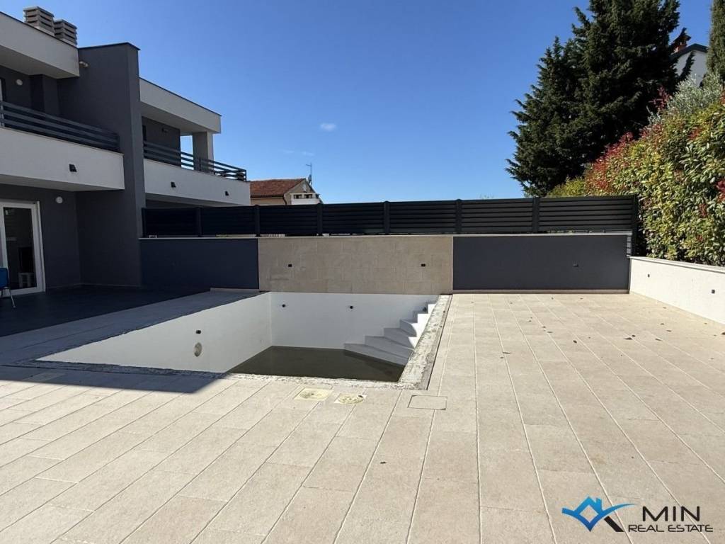 Na prodaju je moderna dvojna kuća na mirnoj lokaciji u Novigradu. Kuća ima 115 m2 te se sastoji od prizemlja i 1. kata. U prizemlju se nalazi ulazni hodnik, wc, spremište, spavaća soba sa kupatilom, te open space prostor u koji obuhvaća kuhinju s blagovaonicom i dnevni boravak s izlazom na natkrivenu terasu, bazen i sunčalište. Na 1. katu nalaze se 2 spavaće sobe, svaka sa svojim privatnim kupatilom te 2 natkrivene terase od kojih jedna ima pogled na more. Kuća ima dodatnu prostoriju od 20 m2 koja se može koristiti kao garsonjera ( sprovedene su sve instalacije ) ili kao garaža ili dodatno spremište ( ovisno o želji novog vlasnika ). Grijanje i hlađenje u kući je putem klima uređaja. Kući pripada okućnica od 267 m2 na kojem je moguće parkirati nekoliko auta. Kuća se prodaje namještena.