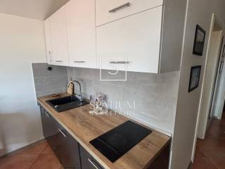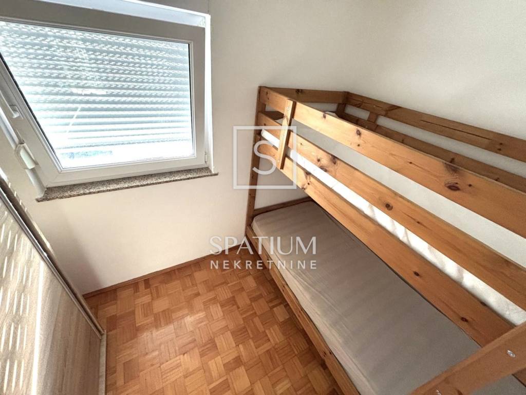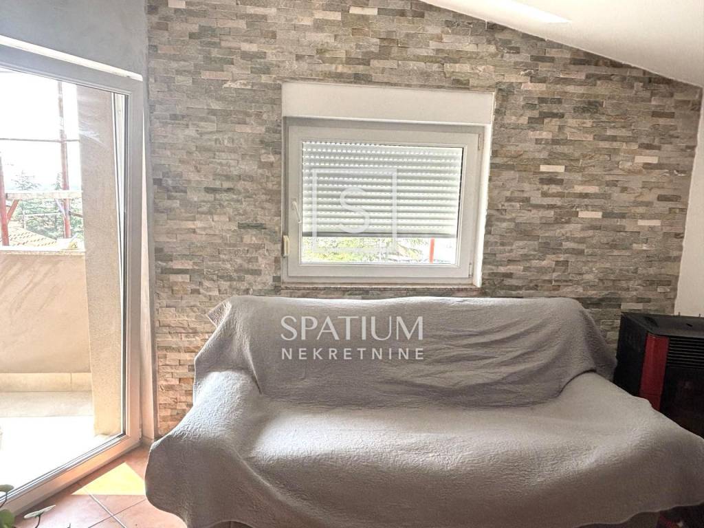 Stan se sastoji od kuhinje s manjim dnevnim dijelom, dvije spavaće sobe, kupaonice, terase i spremišta. Podne obloge kombinacija su parketa, laminata i keramike, što prostoru daje toplinu i funkcionalnost. Za ugodnu temperaturu tijekom cijele godine koristi se peć na pelete i klima inverter Daikin.