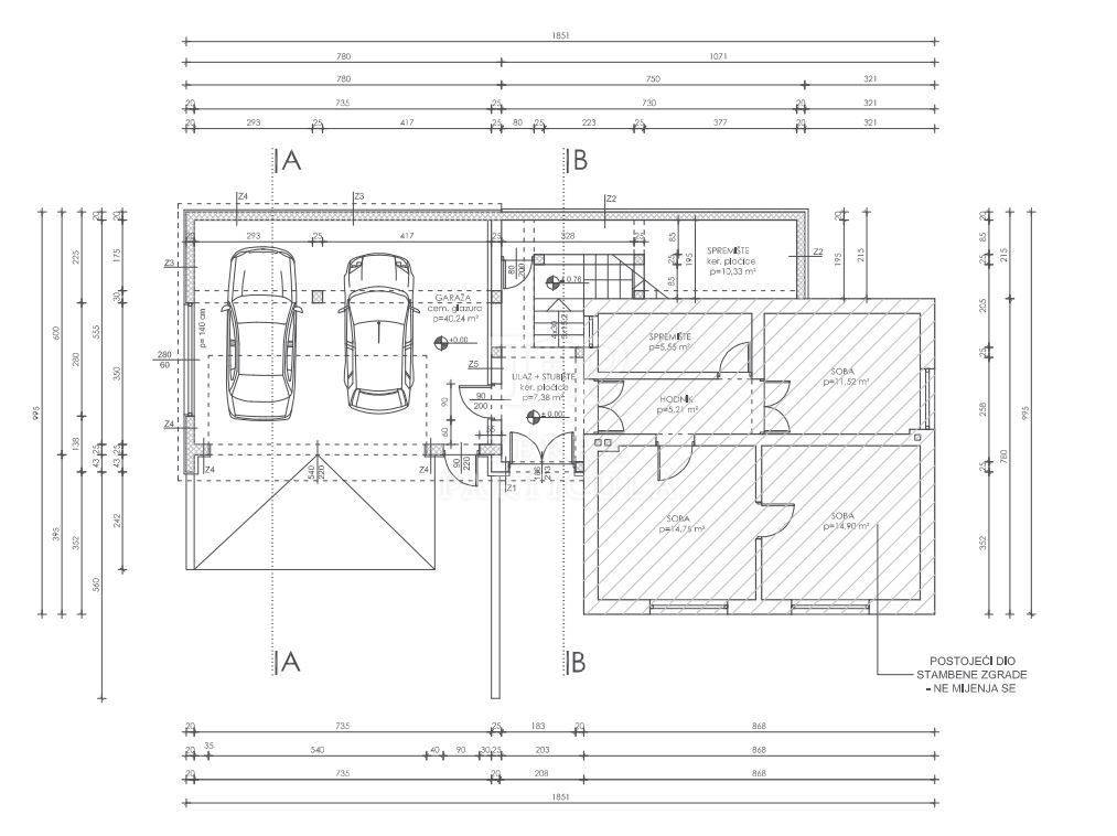 Obiteljska kuća, katnica u fazi obnove s pravomoćnom građevinskom dozvolom te mogućošću formiranja dva odvojena stana površine cca 150 m². Struja, voda, plin, septička. Okućnica od 1.866 m² sastoji se od tri čestice.