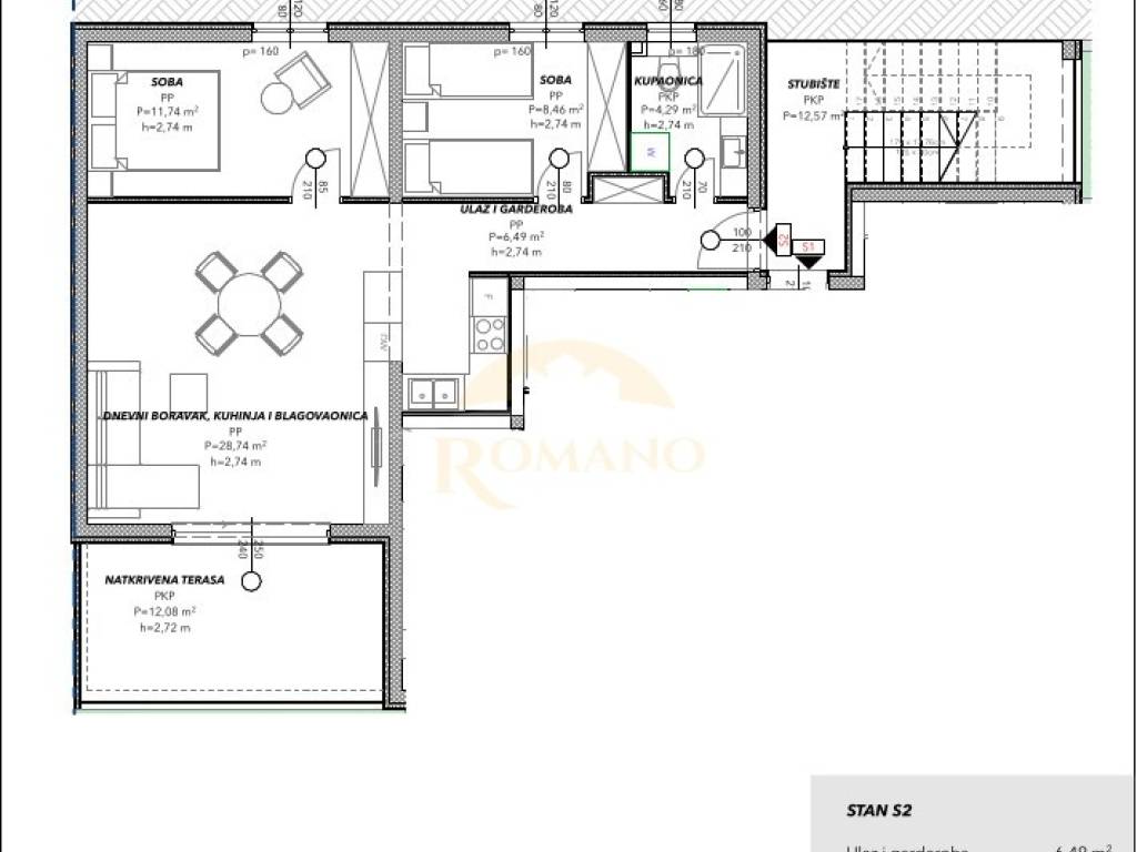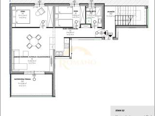 Stan se sastoji od hodnika, dvije spavaće sobe, kupaonice s toaletom, dnevnog boravka s kuhinjom i blagavaonicom sa izlazom na natkrivenu terasu.