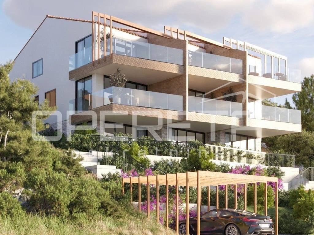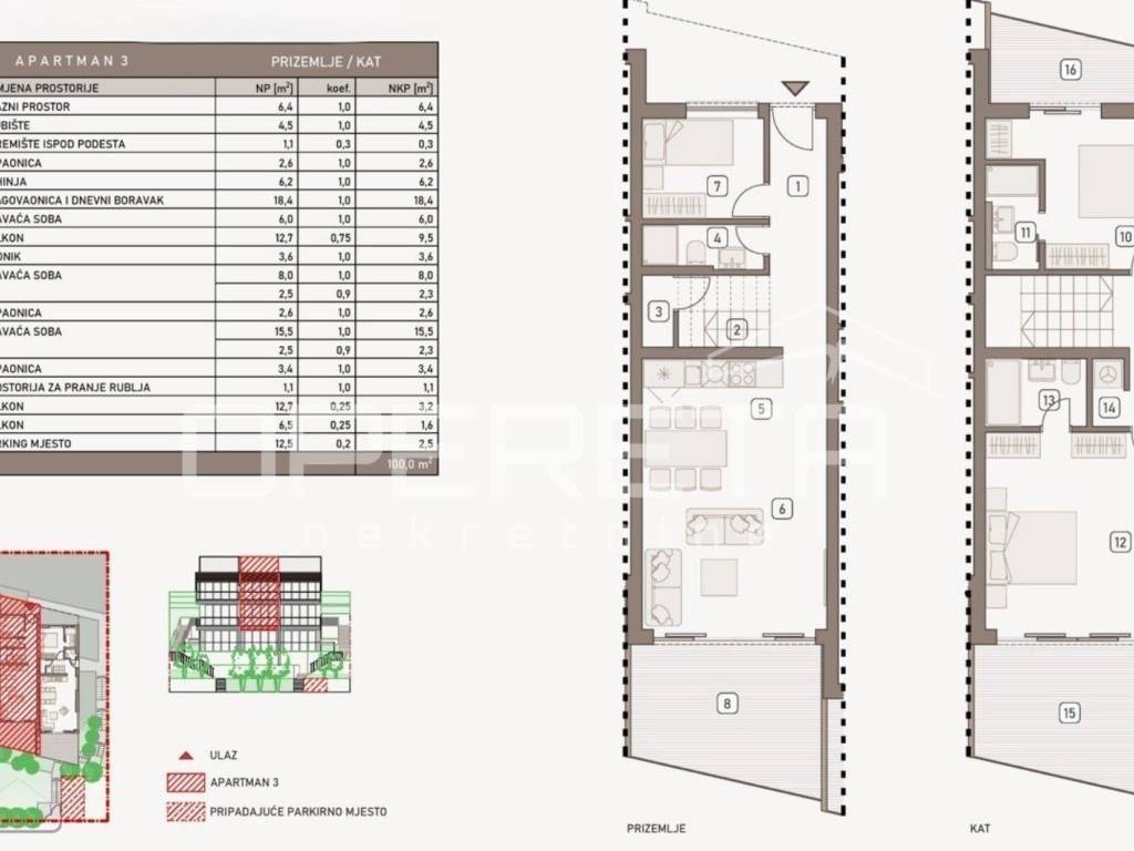 Stan se prostire na dvije etaže i ima ukupnu neto površinu od 100,0 m², s orijentacijom prema sjeveru i jugu. Donji kat čini otvoreni dnevni prostor s kuhinjom i blagovaonicom, te jedna spavaća soba i moderna kupaonica. Iz dnevnog boravka vodi izlaz na balkon s pogledom na zelenilo i more, čime se unutarnji prostor prirodno nadovezuje na eksterijer. Na gornjoj etaži nalaze se dvije spavaće sobe, svaka s vlastitom kupaonicom i privatnim balkonom, što omogućuje mir i zaseban prostor za sve članove domaćinstva.