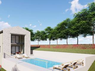 Prizemlje: dnevni prostor s kuhinjom, blagovaonicom i dnevnim boravkom s izlazom na natkrivenu terasu, sunčalište i bazen; dodatno su planirani vešeraj i toalet