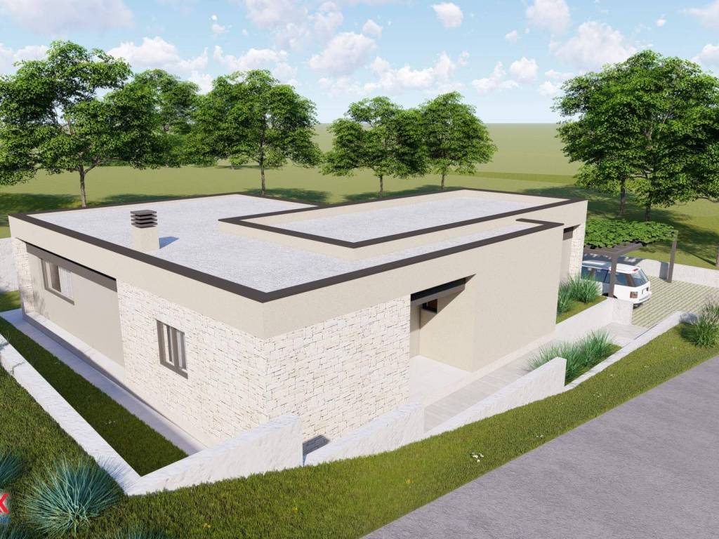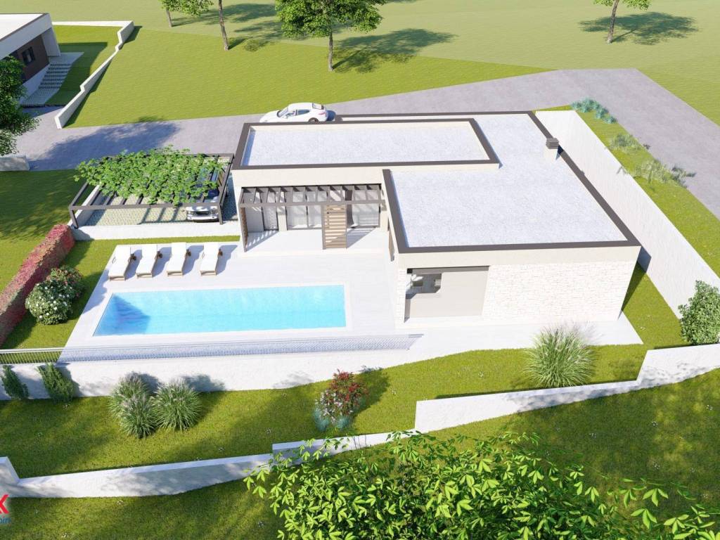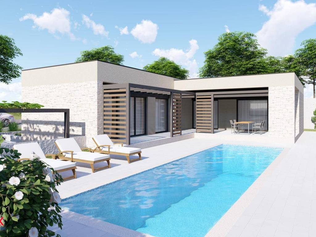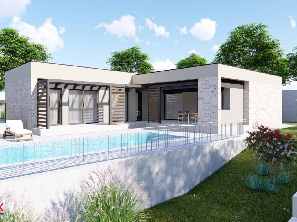 U ponudi je građevinsko zemljište s građevinskom dozvolom za izgradnju moderne prizemnice s bazenom. Projekt je idealan za miran obiteljski život ili turistički najam.