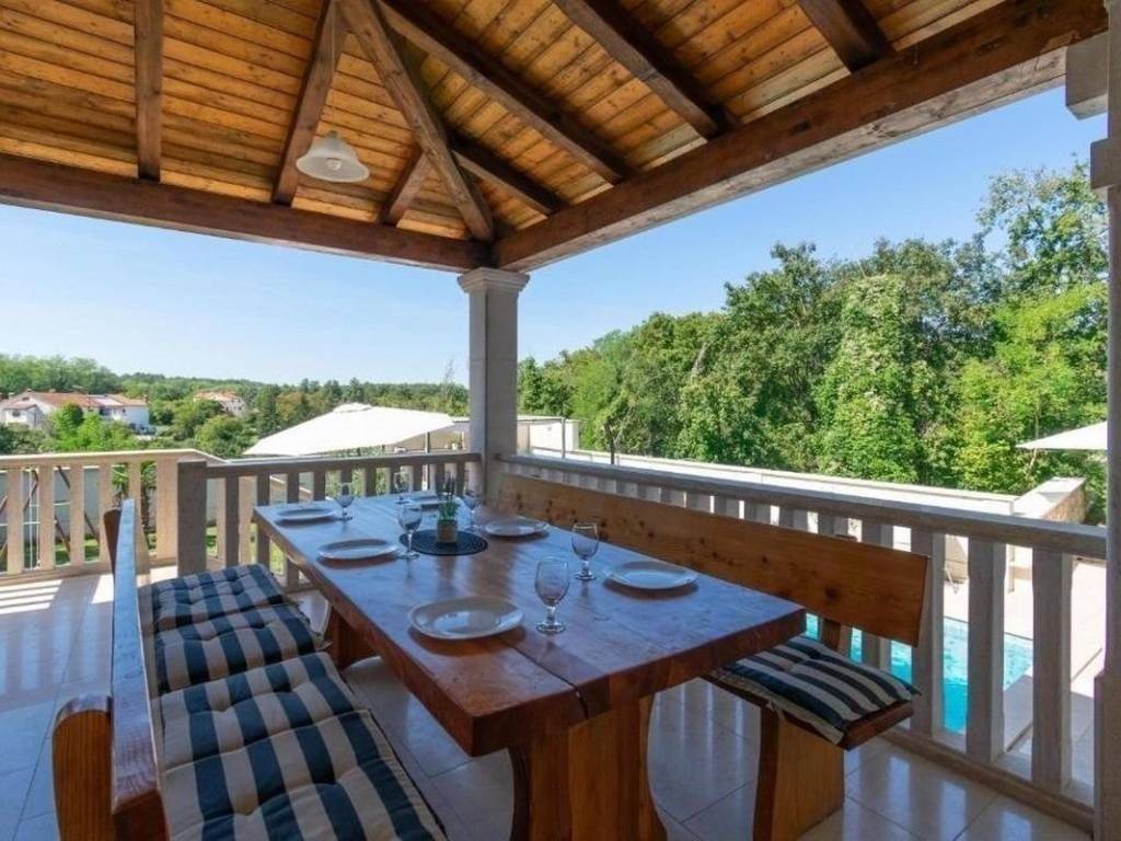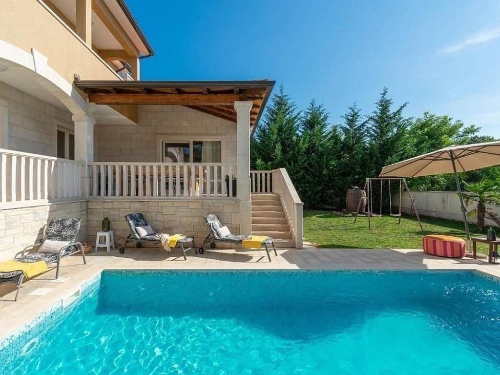 U mirnom dijelu središnje Istre, oko 25 km od mora i približno 1000 metara od osnovnih sadržaja, nalazi se moderna vila ukupne stambene površine 230 m². Smještena je u okruženju prirode i pruža mir i privatnost, uz dobru povezanost s obližnjim mjestima i obalom. U suterenu se nalazi prostor za teretanu, što omogućuje dodatnu funkcionalnost i udobnost boravka. Prizemlje obuhvaća dnevni boravak, kuhinju i blagovaonicu otvorenog koncepta, spavaću sobu s vlastitom kupaonicom, dodatni WC te natkrivenu terasu koja omogućuje boravak na otvorenom tijekom većeg dijela godine. Na katu se nalaze tri prostrane spavaće sobe, svaka s vlastitom kupaonicom i balkonom s pogledom na prirodu i okolni krajolik. Okućnica površine oko 700 m² uređena je i uključuje vanjski bazen od 26 m² sa sunčalištem, što pruža dodatnu vrijednost i komfor. Ispred objekta nalaze se tri parkirna mjesta. Vila se prodaje potpuno namještena i opremljena, spremna za useljenje bez dodatnih ulaganja. Ova nekretnina predstavlja dobru priliku za ugodan obiteljski život u mirnom okruženju ili kao investicija za turistički najam, s obzirom na atraktivnu lokaciju i funkcionalan raspored prostora.