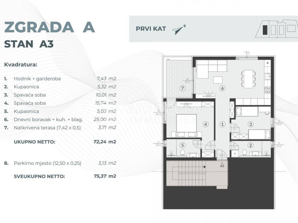 Svi jednosobni i dvosobni stanovi imaju po 1 parkirno mjesto dok trosobni stanovi imaju 2 parkirna mjesta.