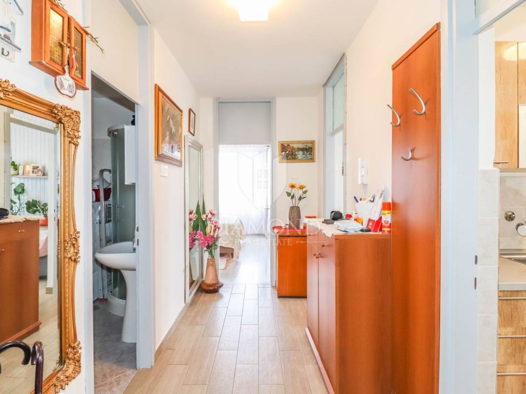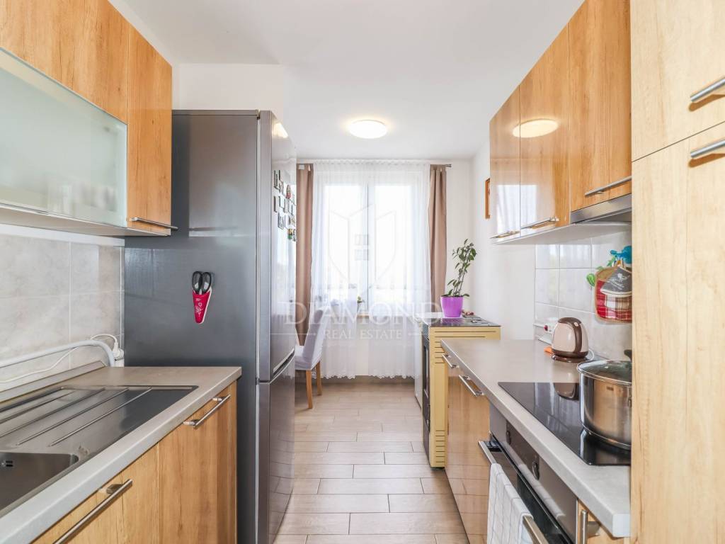 Stan je odlično raspoređen – već na ulazu vas dočekuje hodnik iz kojeg se ulazi u sve prostorije: dvije spavaće sobe, veliku kupaonicu, kuhinju s blagovaonicom, dnevni boravak pun svjetla i balkon idealan za opuštanje. Tu je i ostava koja uvijek dobro dođe.