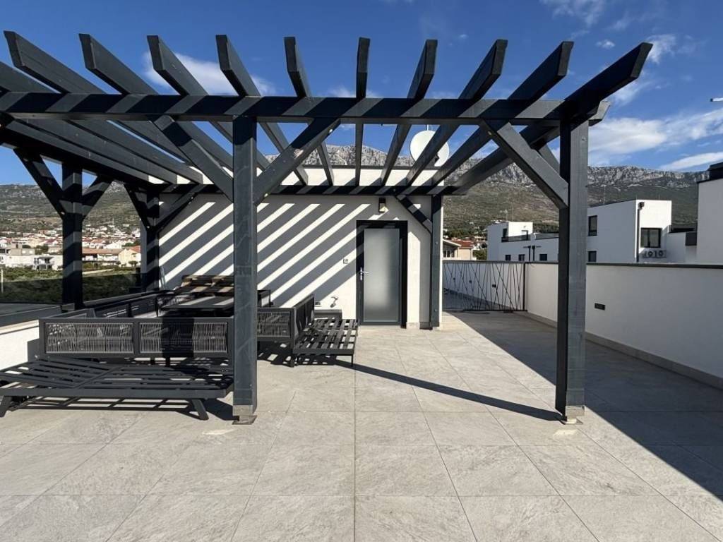 Na prodaju je izvanredan penthouse smješten na odličnoj lokaciji, s otvorenim pogledom na more, u Kaštel Gomilici. Ova nekretnina se nalazi svega 10 minuta lagane šetnje od centra mjesta te je u neposrednoj blizini svih sadržaja koji ovu lokaciju čine izuzetno poželjnom za život i odmor. Penthouse je smješten na drugom katu novogradnje suvremenog dizajna, orijentiran je prema jugozapadu, što osigurava obilje prirodne svjetlosti i prekrasan pogled na more u dnevnom dijelu te ugodnu temperaturu u spavaćim sobama. Stan raspolaže s 53,61 m² stambene površine i sastoji se od dvije spavaće sobe, od kojih jedna ima izlaz na balkon, kupaonice, hodnika, kuhinje, blagovaonice i dnevnog boravka iz kojega se izlazi na balkon s pogledom na more površine. Vanjski prostor ima površinu 83,13 m² i on je najveća prednost ove nekretnine. Na krovu se nalazi prostrana krovna terasa opremljena lounge sjedištem, a s koje se pruža spektakularan panoramski pogled na more – idealno mjesto za vanjsko druženje. Moguće ju je dodatno opremiti po želji kupca, a na njoj su već izvodi za ugradnju ljetne kuhinje i masažne kade. Zgrada je izgrađena korištenjem visokokvalitetnih materijala, a grijanje i hlađenje je osigurana putem klima uređaja te podnog grijanja u cijelom stanu. Od dodatne opreme ističu se protuprovalna vrata, komarice, električni podizači roleta, video portafon te kvalitetan namještaj i oprema u stanu koji dolaze uz njega. U podrumu zgrade se nalazi pripadajuće garažno parkirno mjesto koje vodi u stan. Ovaj penthouse predstavlja savršen spoj elegancije, funkcionalnosti i moderne udobnosti, te je idealan kako za osobno stanovanje, tako i za luksuzni turistički najam.