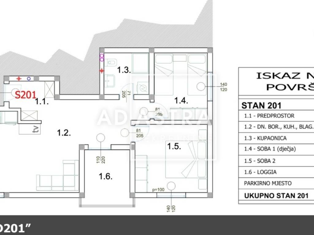 Stan D201 nalazi se na drugom katu stambene zgrade te je ukupne neto površine 64,17 m2. Sastoji se od ulaznog hodnika, dvije spavaće sobe, svijetlog dnevnog boravka s kuhinjom i blagovaonicom, moderne kupaonice s tuš kadom te natkrivene lođe koja pruža ugodan prostor za boravak na otvorenom.