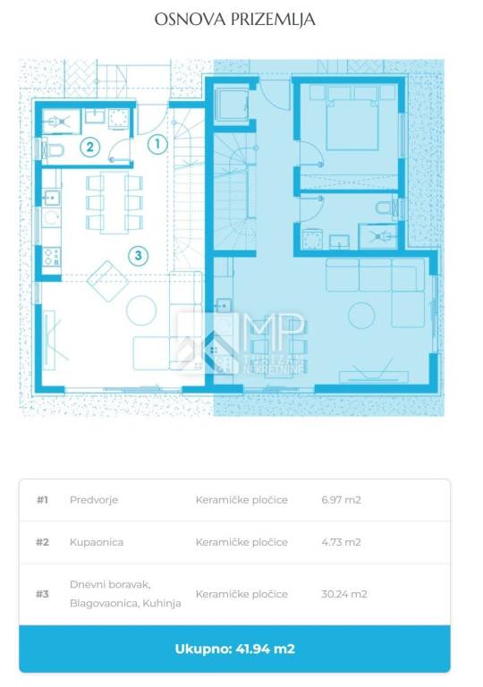 - Dnevni boravak, blagovaonica i kuhinja: 30,24 m²