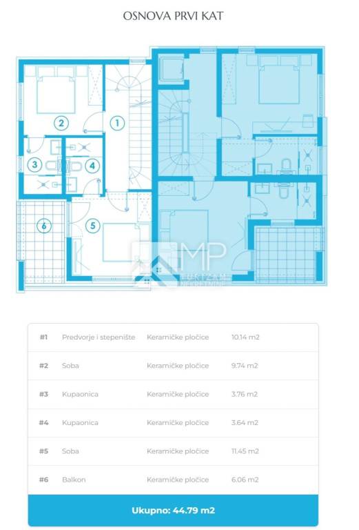 Prvi kat – 44,79 m - Prvi kat nudi dvije udobne spavaće sobe s pogledom na okolnu prirodu, uz dvije kupaonice i balkon. Savršeno rješenje za privatni dio kuće s udobnim prostorom za goste ili obitelj.