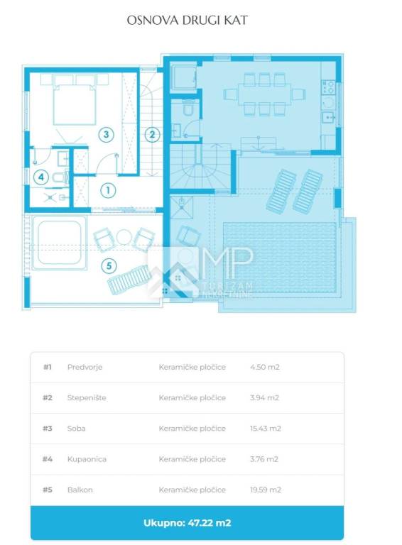 Drugi kat – 47,22 m - Na vrhu vile nalazi se master spavaća soba s vlastitom kupaonicom i velikim balkonom koji pruža prekrasan pogled na more. Oaza privatnosti i luksuza – idealna za jutarnju kavu uz pogled na Jadran.