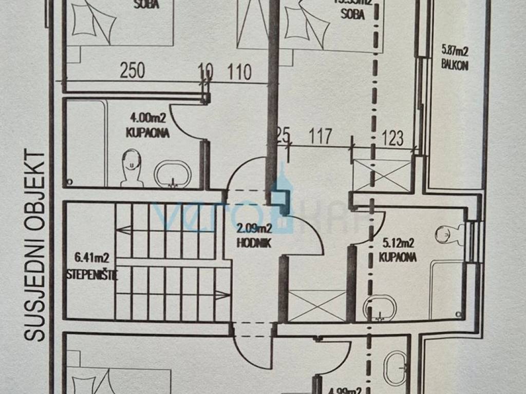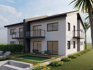 Novogradnja. Nova dvojna kuća-katnica 130 m2 sa tri spavaće sobe, tri kupaonice,tri balkona na katu a u prizemlju kuhinje sa dnevnim boravkom i blagovaonom, hodnika, toaleta te još jedne kupaonice,sobe,spremišta i bazena 15 m2.