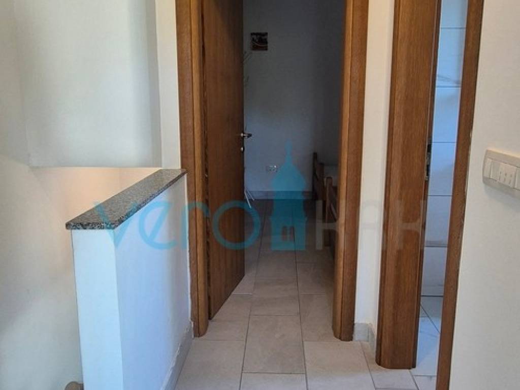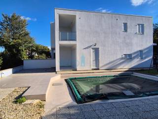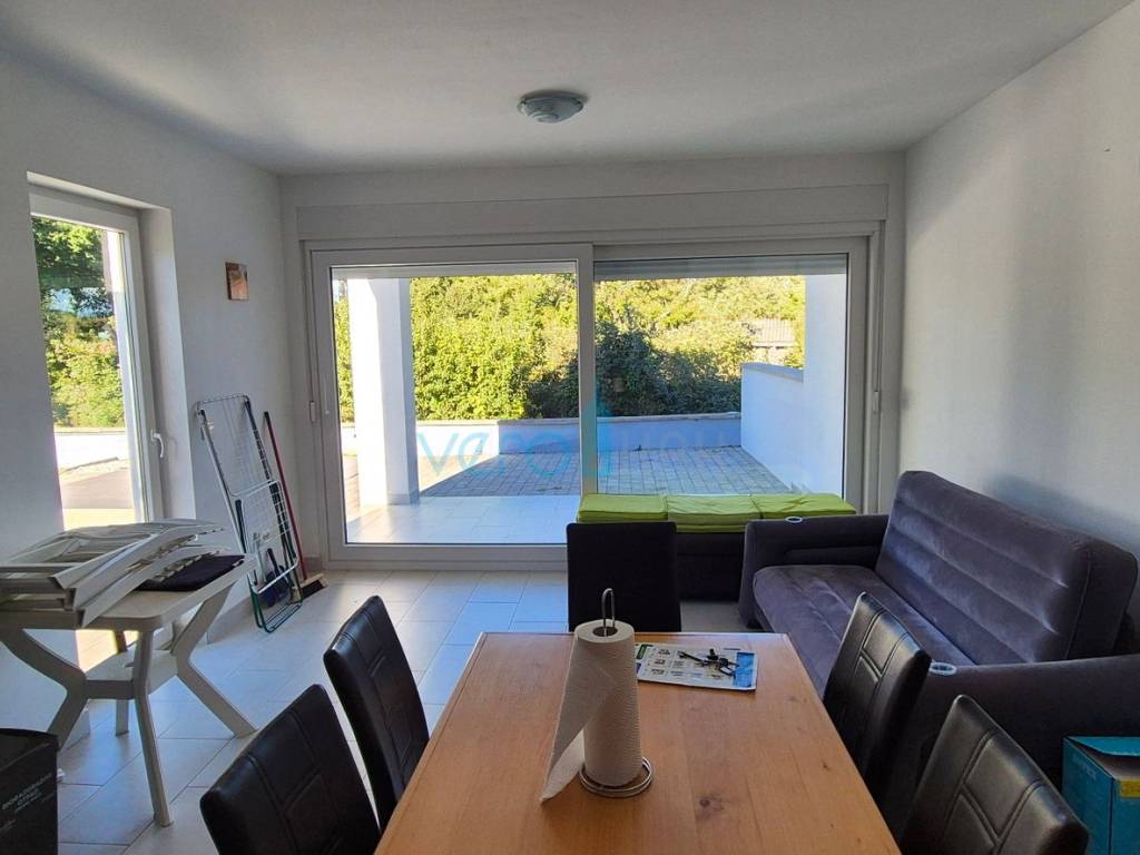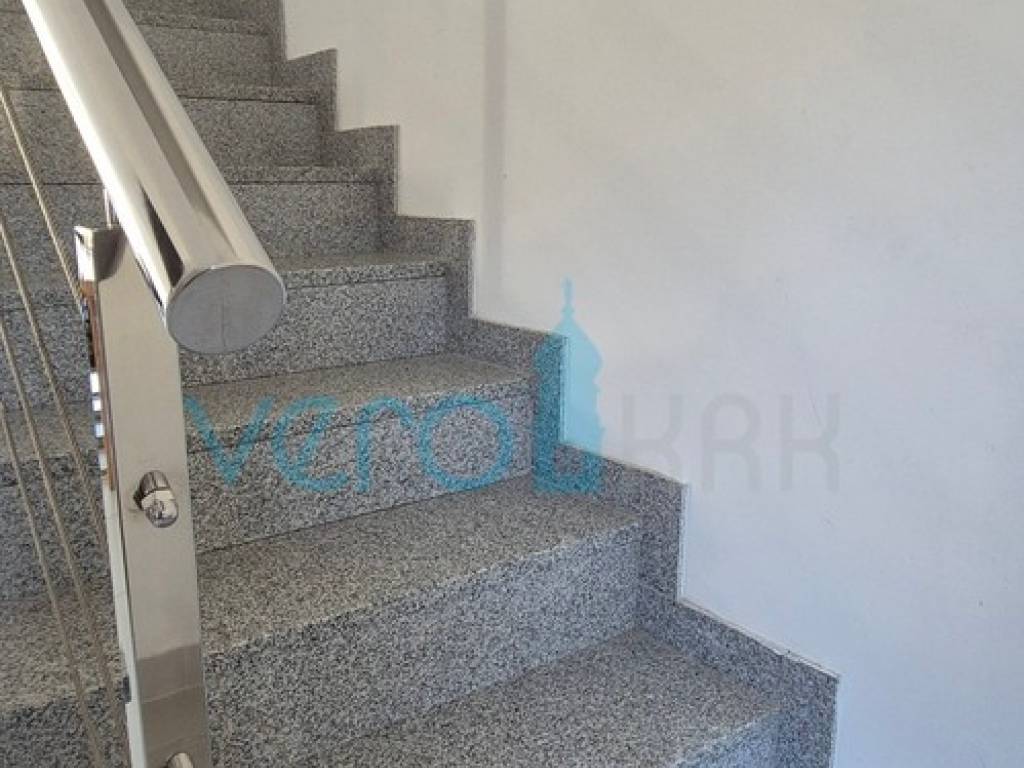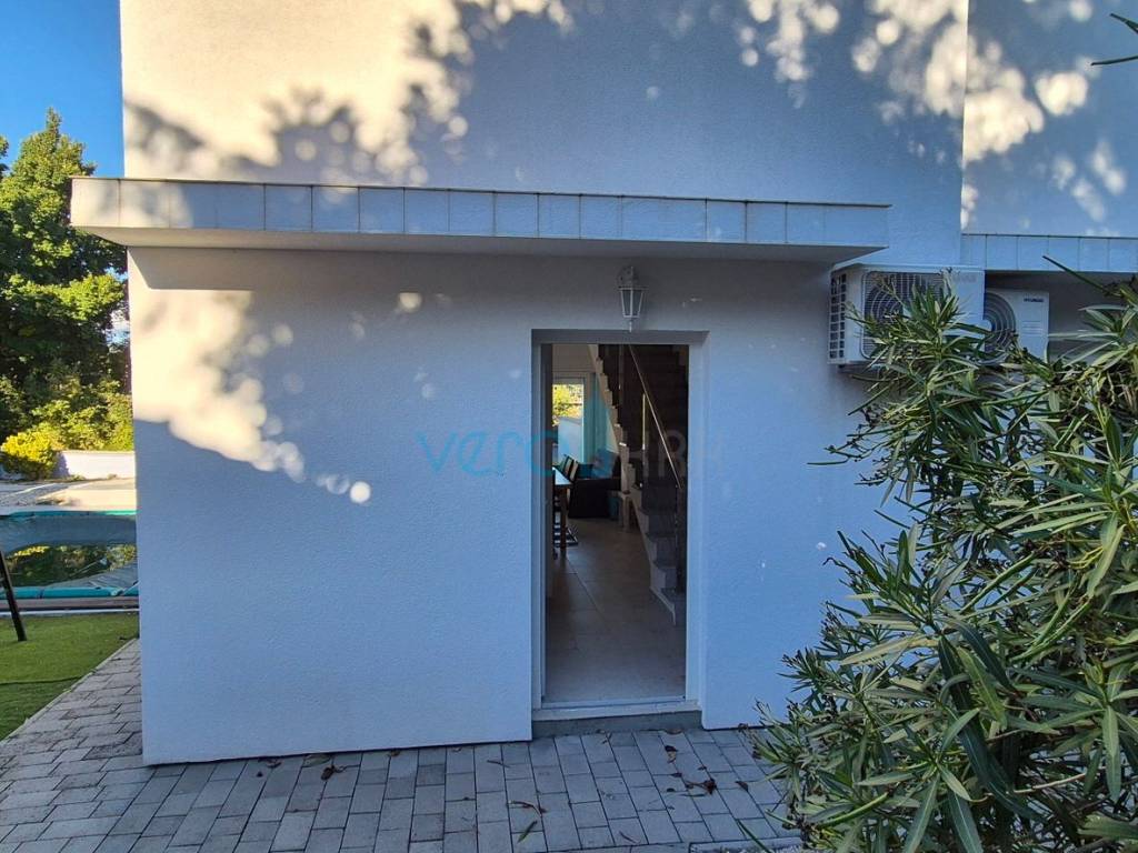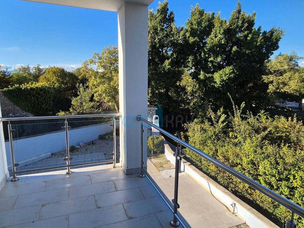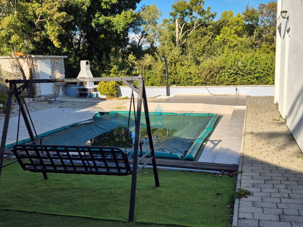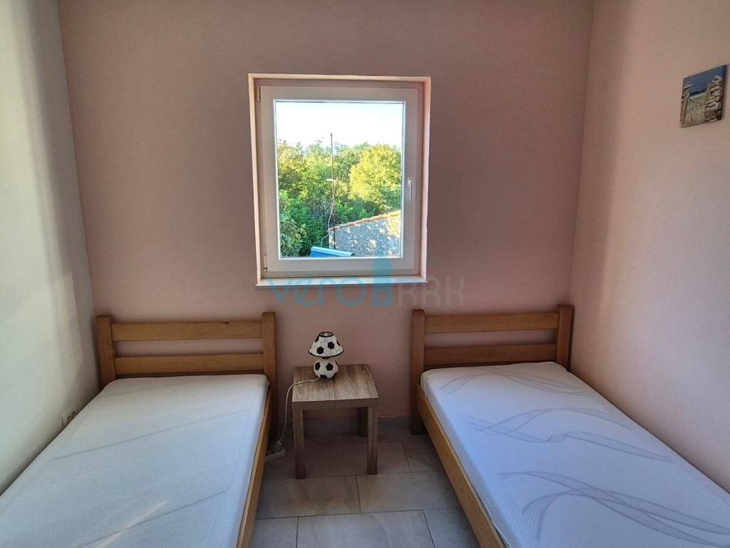 Otok Krk, Malinska, šira okolica, dvojna kuća s bazenom i okućnicom izgrađena 2017. godine u mirnom okruženju prirode u okolici Malinske. Stambeni prostor razveden na prizemlje i prvi kat, ukupne površine 78 m2. U prizemlju je dnevni boravak, kuhinja i blagovaonica,  WC-a i natkrivena terasa. Unutarnje stepenište povezuje prizemlje s prvim katom gdje je odvojen spavaći dio kuće s dvije spavaonice, kupaonicom i balkonom. Na uređenoj okućnici površine 200 m2 je parking za 2 automobila, pomoćni objekt, prostor za roštilj, terasa sa sunčalištem i bazen.