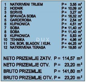 ISTRA, SVETVINČENAT - Moderna prizemnica s bazenom u mirnom okruženju  Svetvinčenat je autentično istarsko naselje poznato po bogatoj povijesti, kulturi, te mirnom načinu života, okruženo zelenilom i udaljeno svega 20-ak minuta od obale i turističkih središta kao što su Rovinj, Fažana i Pula.  U srcu idilične Istre, u slikovitom mjestu Svetvinčenat, smjestila se ova moderna prizemnica koja nudi savršeni spoj udobnosti, funkcionalnosti i mirnog okruženja. Ova elegantna kuća nalazi se unutar novog naselja od ukupno 6 modernih prizemnica, što jamči ekskluzivnost, sigurnost i tišinu.  Tlocrtno savršeno organizirana, kuća je površine 114,57 m² neto zatvorenog prostora, a raspolaže s: - 3 prostrane i osvijetljene spavaće sobe - 2 suvremene kupaonice - Open space dnevnim boravkom, blagovaonicom i kuhinjom – prozračan i svijetao prostor idealan za obitelj i druženja - Ljetnom kuhinjom – savršena za uživanje u istarskim delicijama pod vedrim nebom - Natkrivenom terasom od 19,65 m² – stvorenoj za opuštanje tijekom vrućih ljetnih dana - Privatnim bazenom površine 23,46 m² – s prostranim sunčalištem i potpunom privatnošću - Tehničkom prostorijom, garderobom i servisnom zonom  Ukupna bruto površina prizemlja iznosi 141,80 m², a sve se to prostire na prostranoj okućnici od čak 633 m², ograđenoj zidom i ukrašenoj zelenilom.  Tehničke karakteristike: - Podno grijanje – osigurava toplinu i udobnost tijekom cijele godine - Klima uređaji – za optimalnu temperaturu u svakom kutku doma - Kvalitetna gradnja, vrhunska izolacija i pažljivo odabrani materijali - Privatni parking za vaša vozila  Kuća je trenutno u fazi izgradnje, što omogućava mogućnost odabira završnih detalja po želji kupca  Ova suvremena vila s karakterom idealna je kako za obiteljski život, tako i za investiciju u turistički najam. Kombinacija moderne arhitekture, mirne lokacije i praktičnog rasporeda prostorija čini ovu nekretninu iznimno atraktivnom.  Ne propustite priliku da postanete vlasnik ove jedinstvene prizemnice u mirnom i zelenom dijelu Istre!  Poštovani klijenti, agencijska provizija naplaćuje se u skladu s Općim uvjetima poslovanja www.dux-nekretnine.hr/opci-uvjeti-poslovanja  ID KOD AGENCIJE: 42599  Tina Širol Agent s licencom Mob: +385 95 825 4533 Tel: +385 99 640 8438 E-mail: tina@dux-istra.com www.dux-istra.com