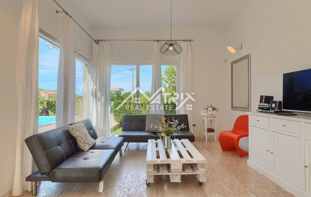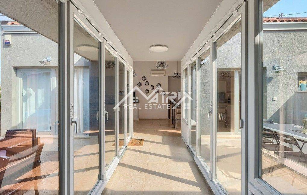Moderna prizemnica od 147 m² u mirnoj okolici Poreča, svega oko 5 km od grada i uređenih plaža, nudi promišljenu prostornu organizaciju i ugodan, suvremen život bez stepenica. Dnevna zona je otvorenog tipa — kuhinja, blagovaonica i dnevni boravak skladno su povezani — dok je spavaći trakt diskretno odvojen i obuhvaća tri spavaće sobe, od kojih master ima vlastitu kupaonicu. Poseban dojam stvara stakleni hodnik izveden kao pomične stijene koje se ljeti potpuno otvaraju i povezuju obje strane parcele, donoseći obilje prirodnog svjetla i osjećaj zračnosti. Ispred kuće nalaze se prostrano sunčalište i bazen za opuštanje u toplim mjesecima, a u središtu tlocrta smještena je praktična ljetna kuhinja — idealna za ležerna druženja i obroke na otvorenom. Kuća je funkcionalna, svijetla i udobna, opremljena klima uređajima i radijatorima, a zahvaljujući blizini grada i svih sadržaja predstavlja i vrlo dobru investiciju za turistički najam.