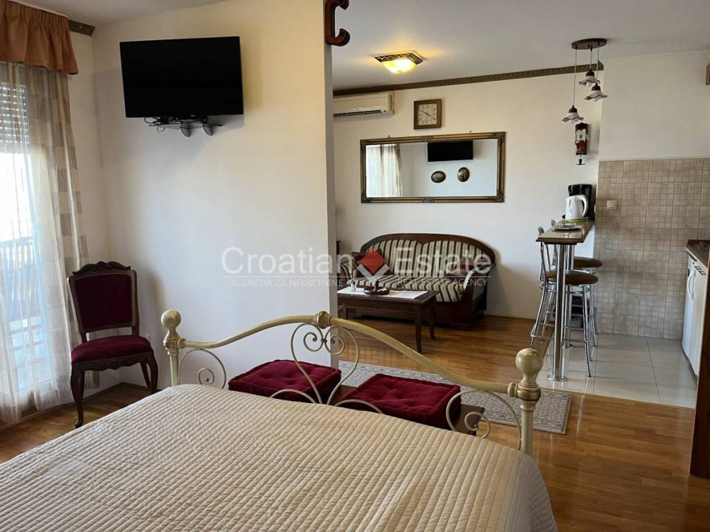 Iznajmljujemo jednosobni stan s pogledom na more stambene površine 55m2, smješten na petom katu zgrade s liftom. Sastoji se od kuhinje s blagovaonicom i dnevnim boravkom, spavaće sobe, kupatila i velike terase površine 35m2.