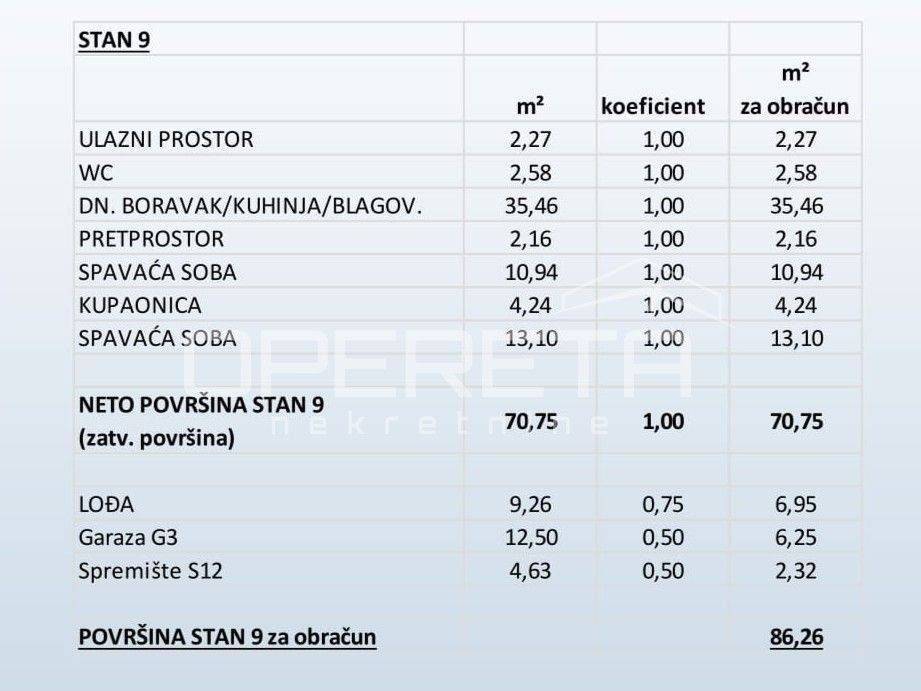 Stan S9 nalazi se na drugom katu zgrade. Sastoji se od 2 spavaće sobe, kuhinje, dnevnog boravka i blagovaonice, kupaonice, toaleta te hodnika. Pripada mu i loggia površine 9,26 m2, spremište te garažno parkirno mjesto.