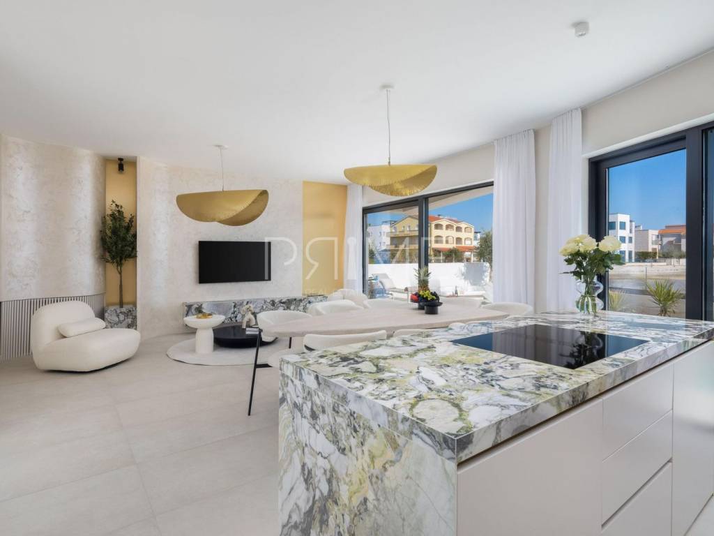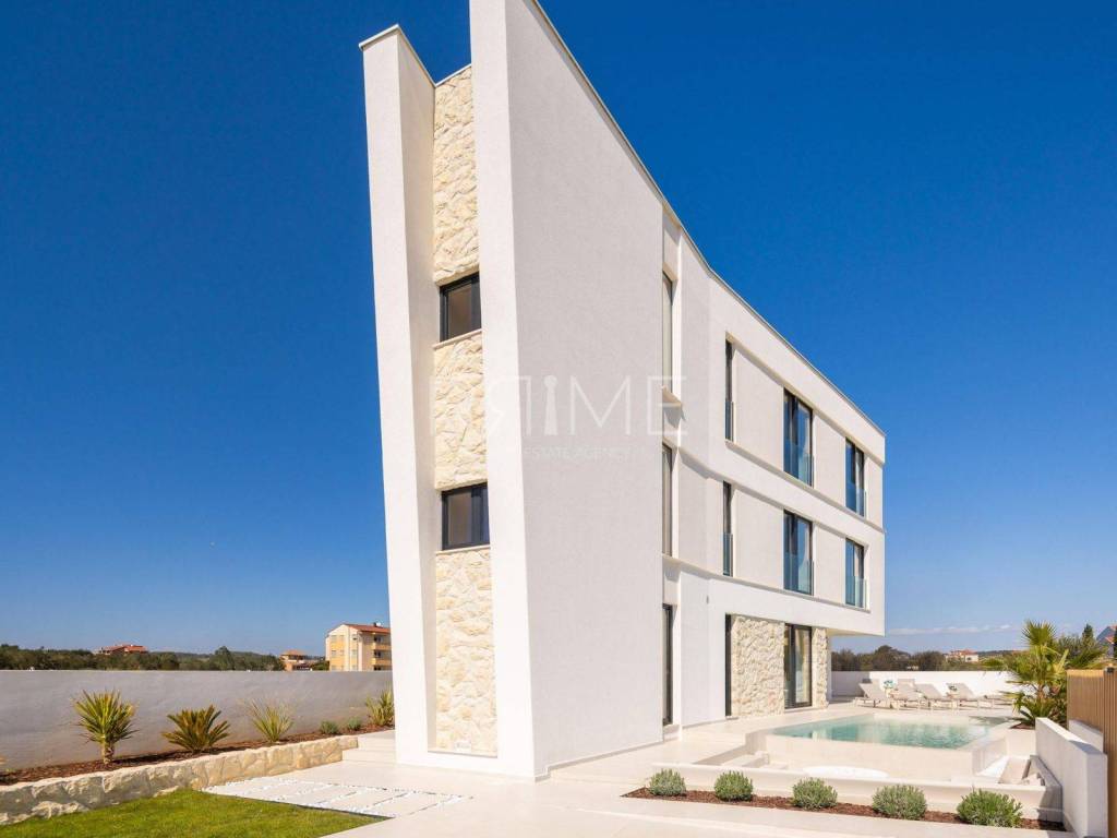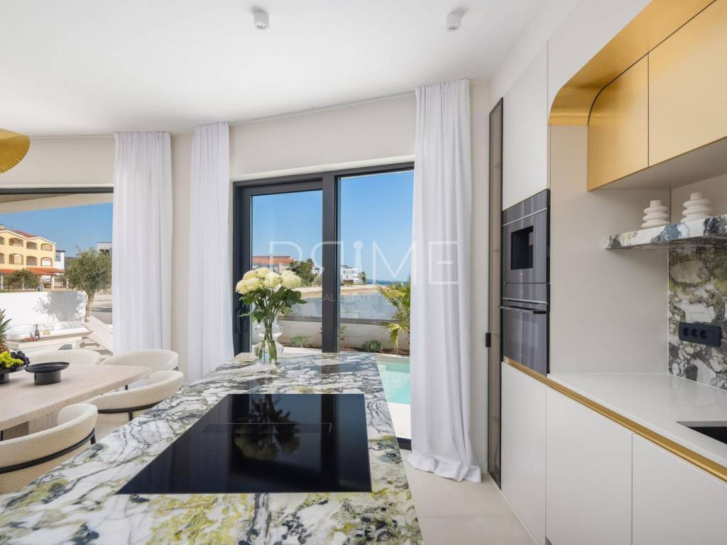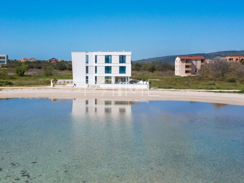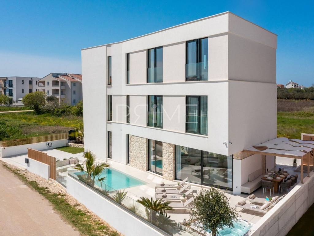 Luksuzna vila površine 174 m2 nalazi se na parceli površine 324 m2. Nalazi se na jedinstvenoj lokaciji u prvom redu do mora, iz dvorišta se izlazi direktno na plažu. Sastoji se od tri etaže: prizemlja, prvog i drugog kata. U prizemlju se nalaze kuhinja, blagovaona, dnevni boravak, wc, vešeraj, strojarnica i natkrivena terasa. Na prvom katu se nalaze dvije spavaće sobe s vlastitim  kupaonicama. Isti raspored se ponavlja i na drugom katu (dvije spavaće sobe s vlastitim kuponicama). Vila ima vanjski grijani bazen, jacuzzi, fire pit i projektiran je da zadovolji  standarde 5* (u slučaju da se budući vlasnik želi baviti turizmom). Prodaje se kompletno namještena i opremljena kao na slikama. Grijanje i hlađenje se odvija putem dizalice topline, bazen je grijan sa toplotnom dizalicom, postavljena je talijanska keramika u velikim formatima, podno električno grijanje, troslojna aluminijska stolarija, itd. Iz svih prostorija se pruža prekrasan pogled na more.Vila je upravo u završnoj fazi opremanja, završetak svih radova i useljenje je planirano do 01.03.2025 godine.