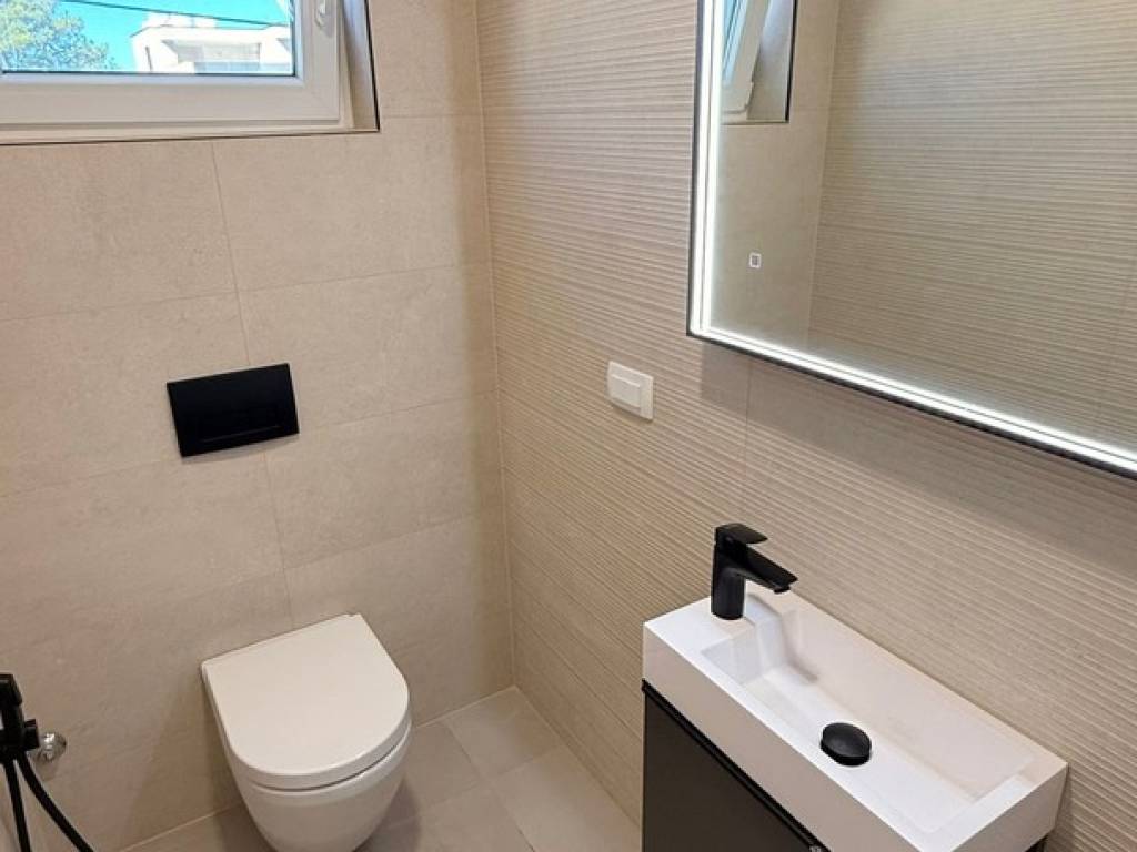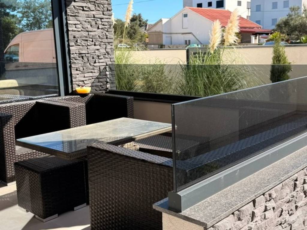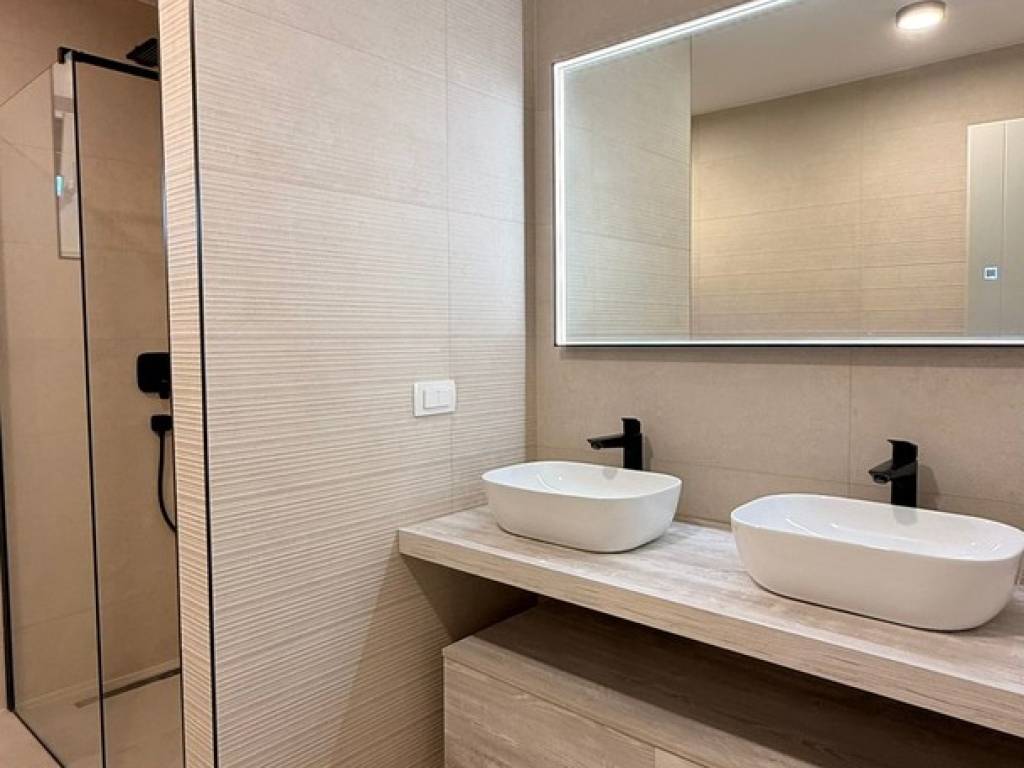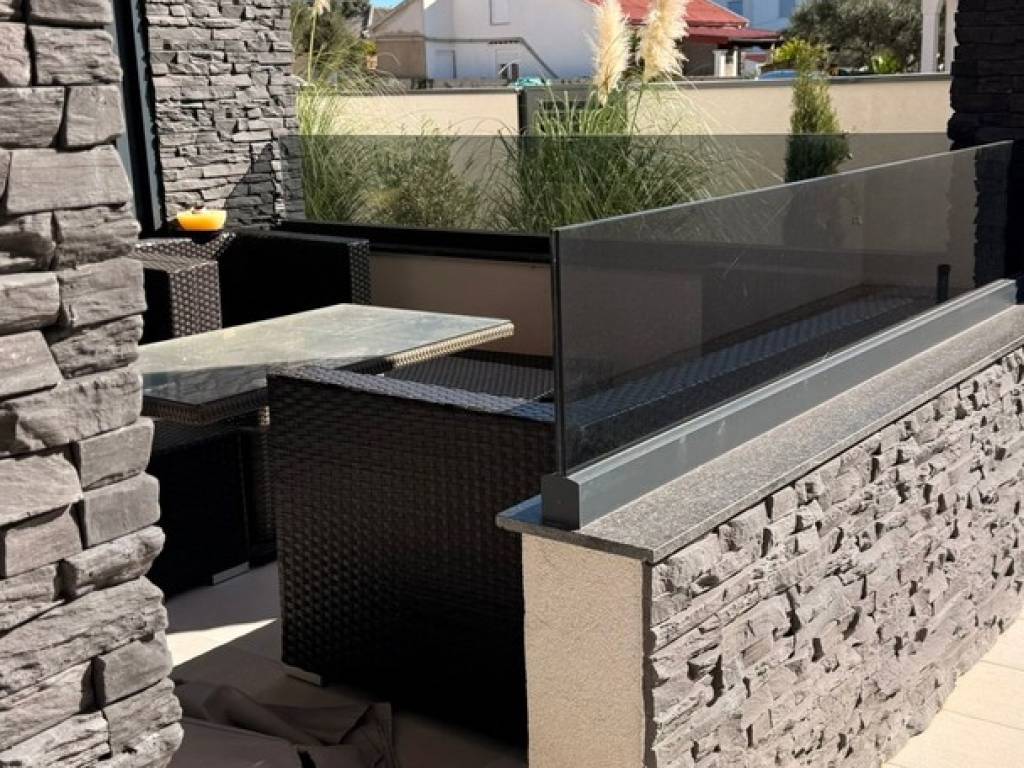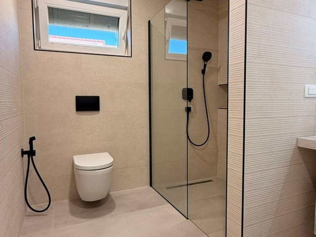 Stambena jedinica S1 - prizemlje 95m2, posjeduje 40m2 dvrorišta i 5m2 ostave te 1 parkirno mjesto. Cijeli stan ima podno grijanje s WiFi upravljanjem, rolete na struju, klima uređaj u spavaćim sobama i dnevnom boravku, protuprovalna vrata s pametnom bravom, mreže za komarce na svim prozorima i staklenim stijenama, odvojene satove za vodu i električnu energiju s posebnim brojilom za zajedničku potrošnju, ratificirane dizajnerske talijanske pločice, Hans Grohe sanitarije. Sastoji se od kupaonice 7,1m2, hodnika+garderobe 9,2m, WC-a 3,05m2, 2 sobe (svaka 12,27m2), blagovaonice+kuhinje 27,95m2, terase 10,96m2. Cijena 410000 EUR
