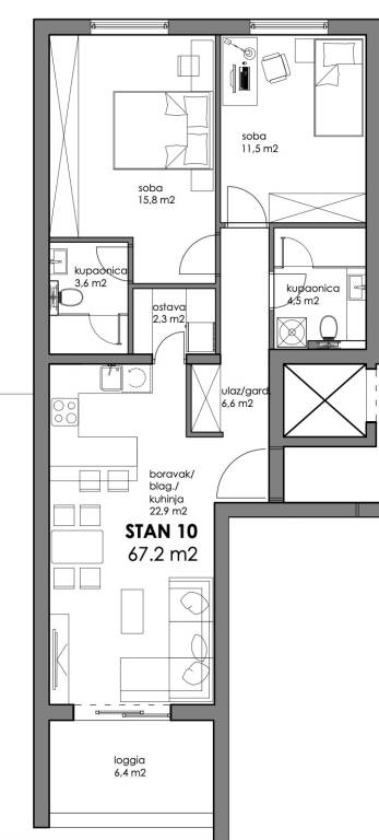 Sastoji se od ulaza/garderobe, ostave, 2 kupaonice, 2 spavaće sobe, dnevnog boravka, kuhinje s blagovaonicom te lođe.