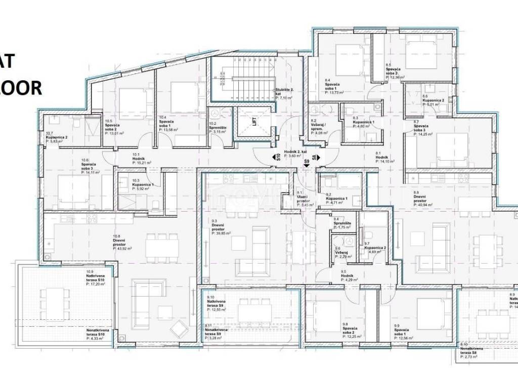 Stambena jedinica S10, nalazi se na 2.katu zgrade, orijentirana je na zapadnoj strani, ima 125,50m2 korisne površine, sastoji se od predsoblja, 2 kupaonice, spremište, 2 spavaće sobe, open space kuhinje s blagovaonom i dnevnim boravkom te izlazom na prostranu natkrivenu terasu od 21,52m2. Stanu pripada ostava u podrumu zgrade te jedno parkirno mjesto;
