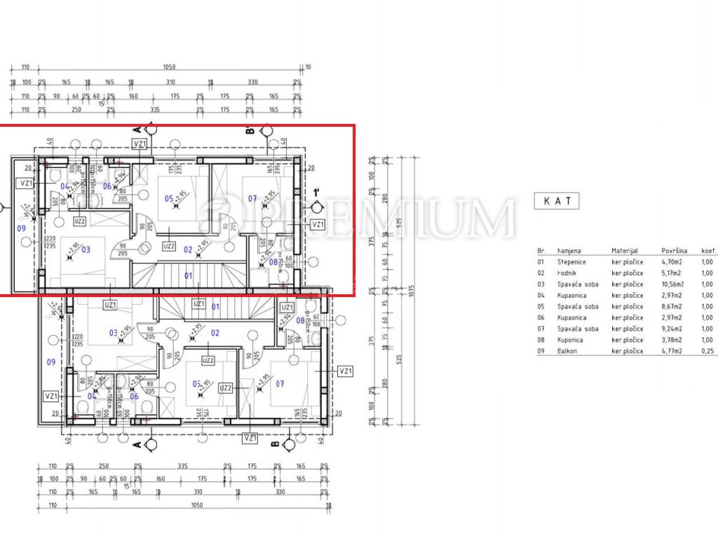 Na katu su smještene 3 spavaće sobe, svaka sa vlastitom kupaonicom, te hodnik.