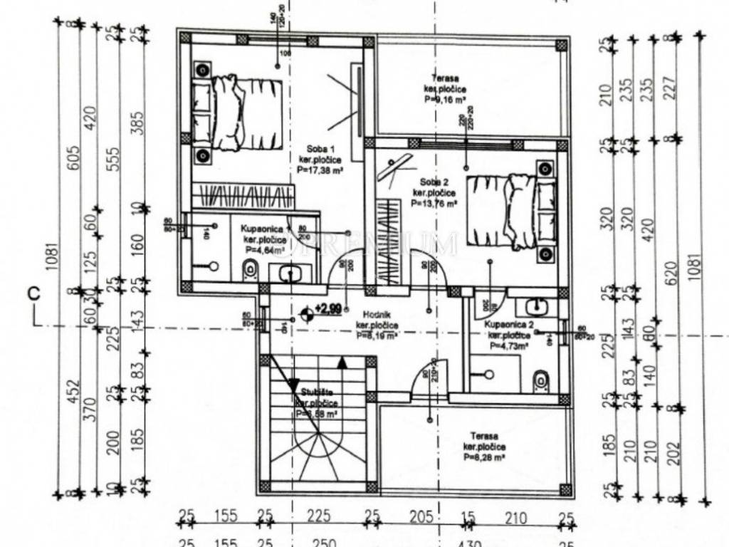 Unutarnjim stepeništem dolazi se na 1. kat kuće, gdje se nalazi hodnik i izlaz na terasu (broj 1), 2 spavaće sobe, svaka sa svojom kupaonicom, a jedna spavaća soba ima izlaz na terasu (broj 2).