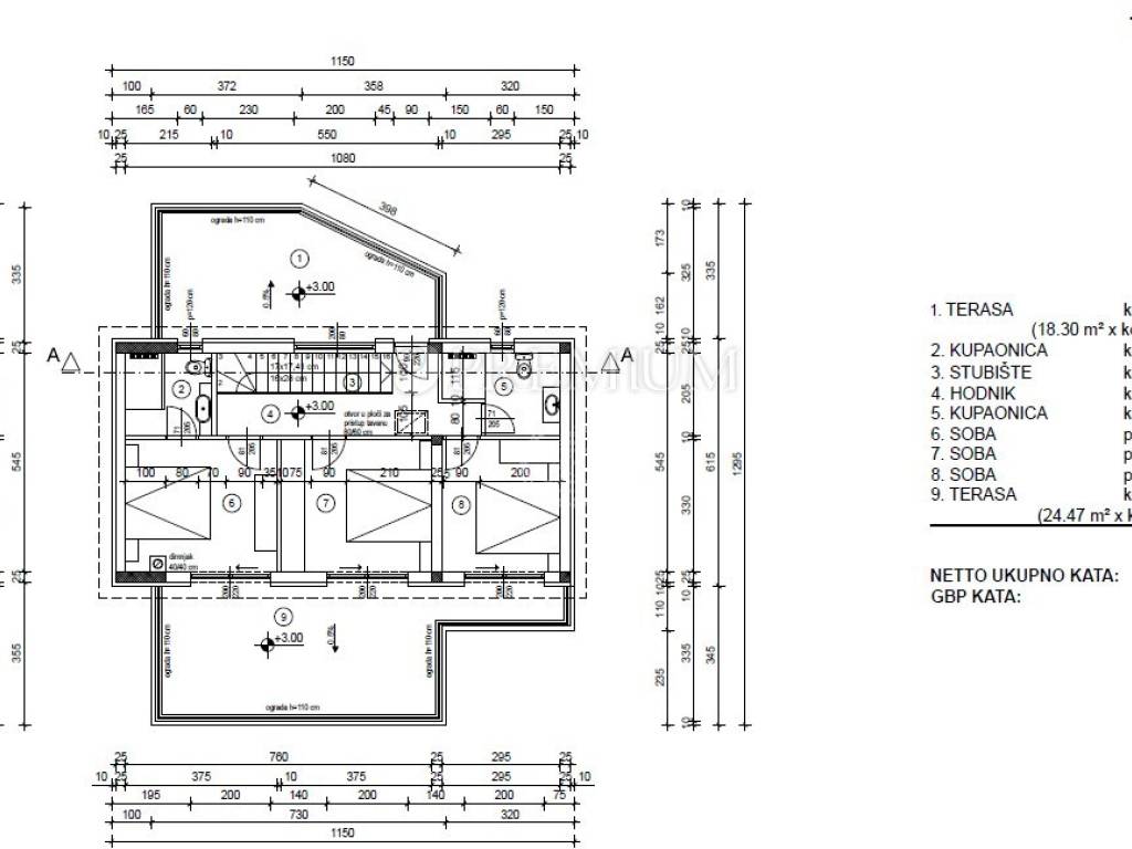 Na katu se nalaze 3 spavaće sobe, od kojih 2 imaju vlastitu kupaonicu, a sve sobe imaju i izlaz na zajedničku terasu.