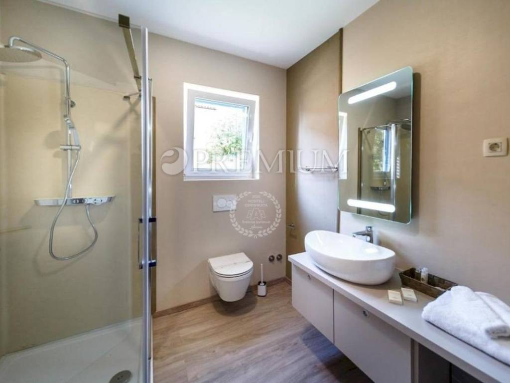 Uređena i ograđena okućnica pruža potpunu privatnost, a uključuje grijani bazen s elektrolizom, jacuzzi, sunčalište, vanjski tuš i roštilj.