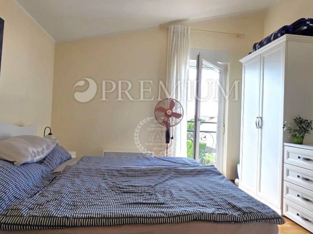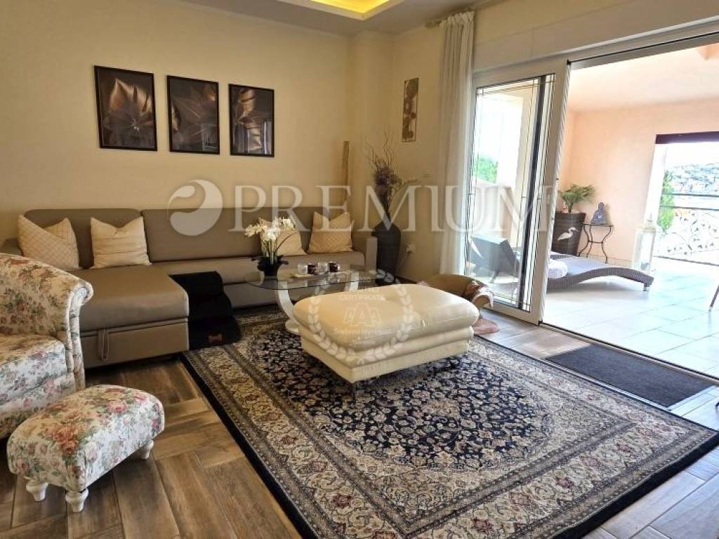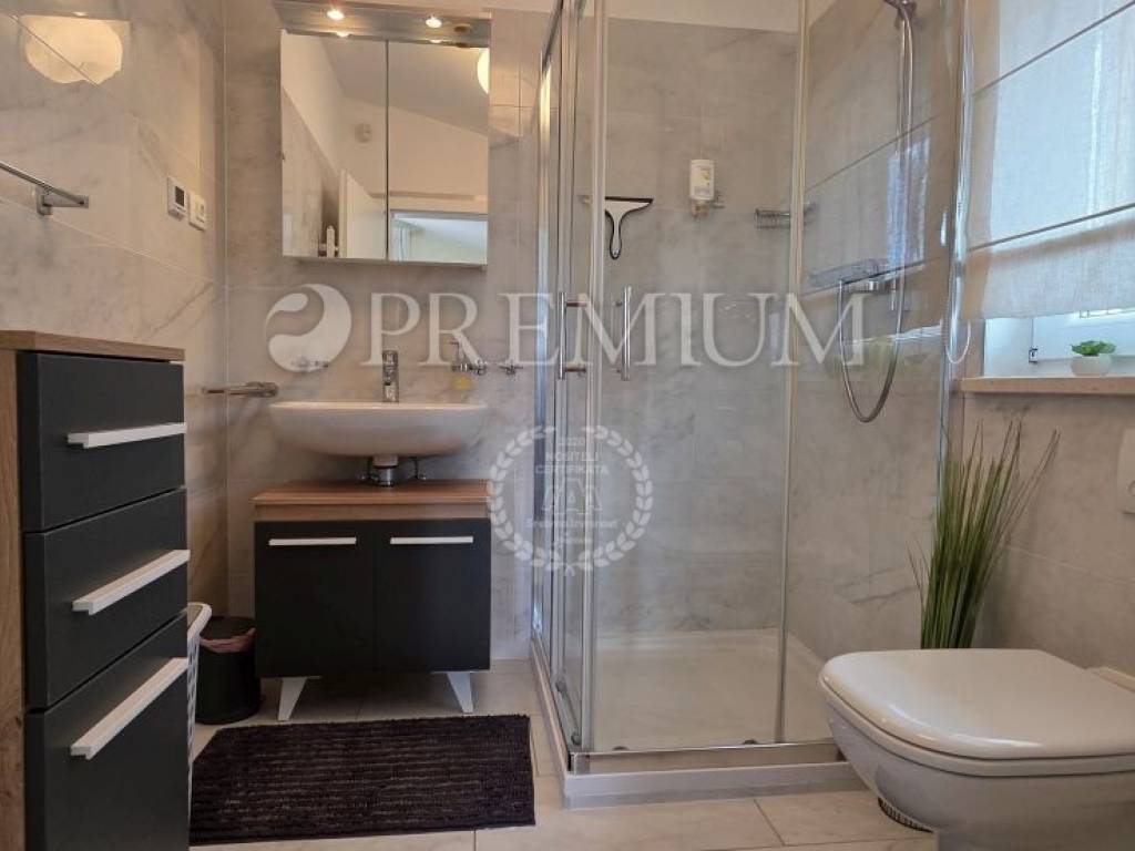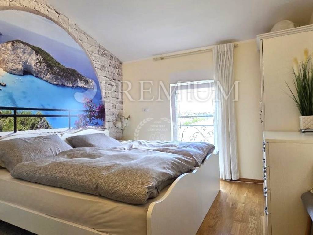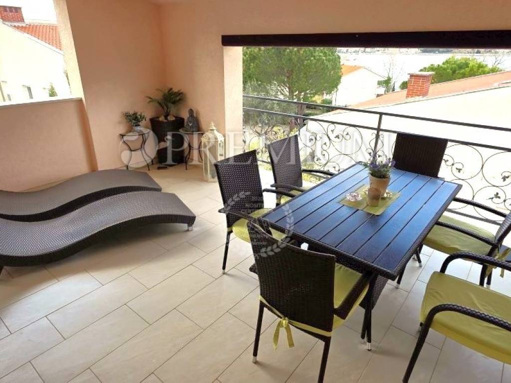 Apartman na drugom katu zgrade građene 2013. godine, s ukupno 6 stambenih jedinica, sastoji se od ulaznog prostora, gostinjskog toaleta, dvije spavaće sobe, svaka sa vlastitom kupaonicom, kuhinje s blagovaonom i dnevnog boravka, s izlazom na terasu s lijepim pogledom na more.